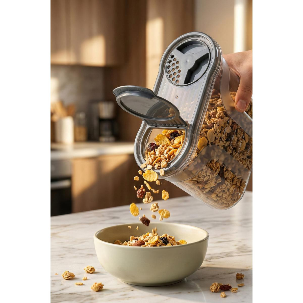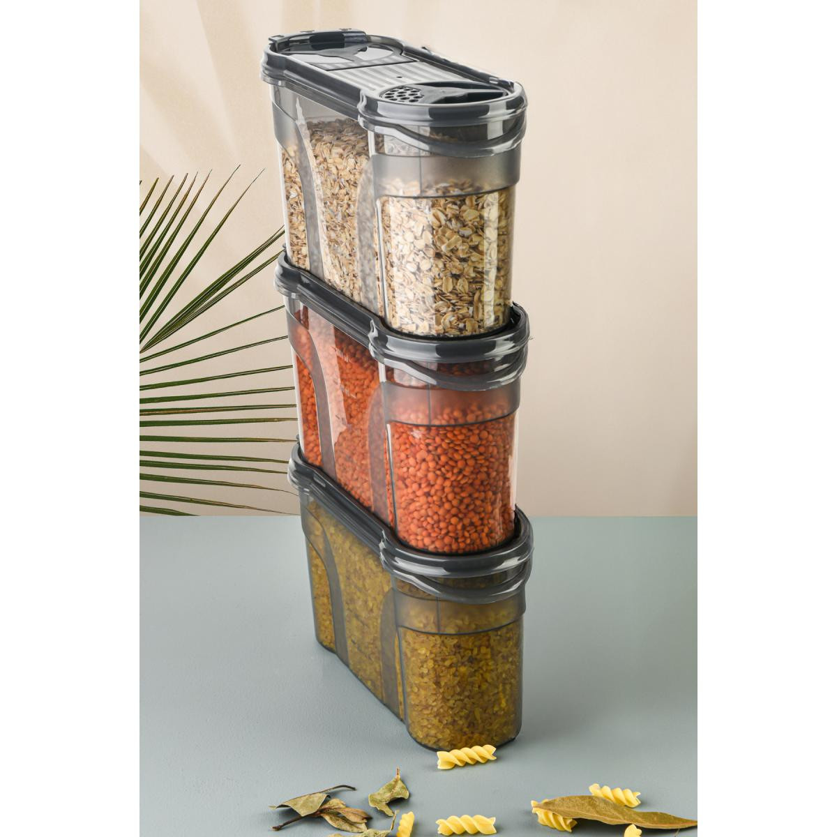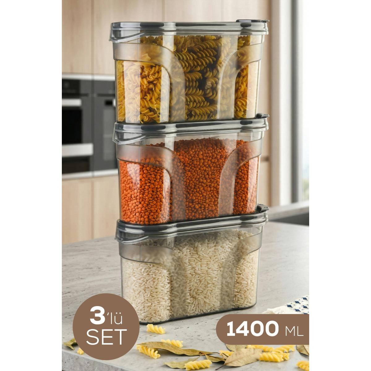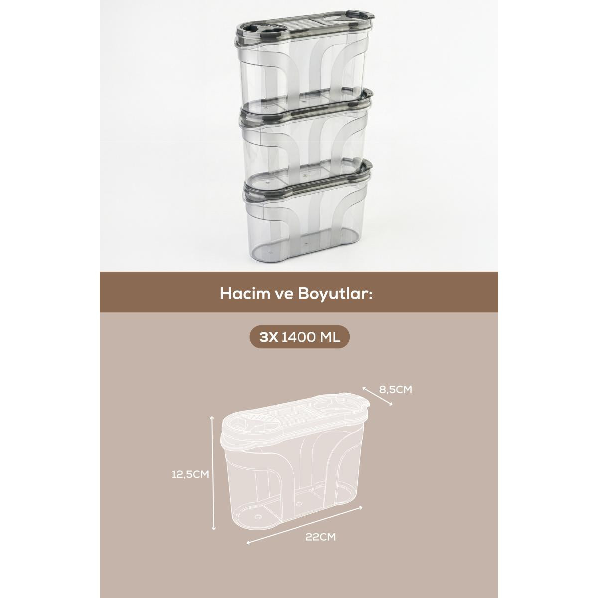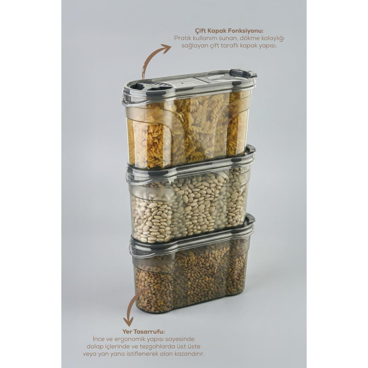 Mutfaklarınızda maksimum düzen ve tazelik sağlayan 3 farklı boydan oluşan erzak kabı seti ile tanışın! Özel çift kapaklı tasarımı sayesinde hem geniş ağızdan doldurma yapabilir hem de küçük kapak kısmından (dökme ağzı) ölçülü boşaltım sağlayabilirsiniz.; ; ; Ürün İçeriği ve Ölçüleri: ; 1400 ml: 22 x 8,5 x 12,5 cm (Küçük Boy) ; ; Ürün Özellikleri: ; Çift Kapak Fonksiyonu: Pratik kullanım sunan, dökme kolaylığı sağlayan çift taraflı kapak yapısı.; ; Şeffaf ve Kaliteli Gövde: İçindeki gıdayı kolayca görebilir, eksilen ürünleri kapak açmadan takip edebilirsiniz.; ; Yer Tasarrufu: İnce ve ergonomik yapısı sayesinde dolap içlerinde ve tezgahlarda üst üste veya yan yana istiflenerek alan kazandırır.; ; Sağlıklı Malzeme: BPA içermez, gıda ile temasa %100 uygundur.; ; Çok Amaçlı Kullanım: Makarna, pirinç, mercimek, nohut gibi bakliyatların yanı sıra mısır gevreği, kuruyemiş veya un saklamak için idealdir.; ;