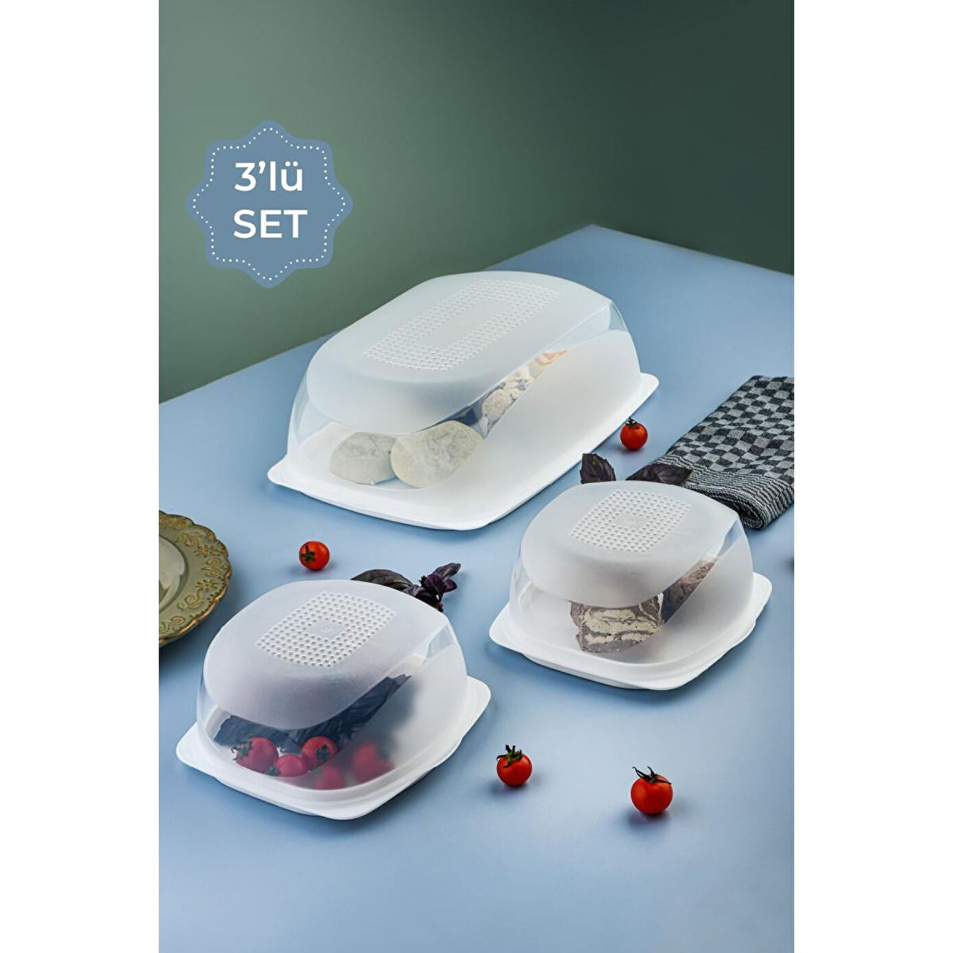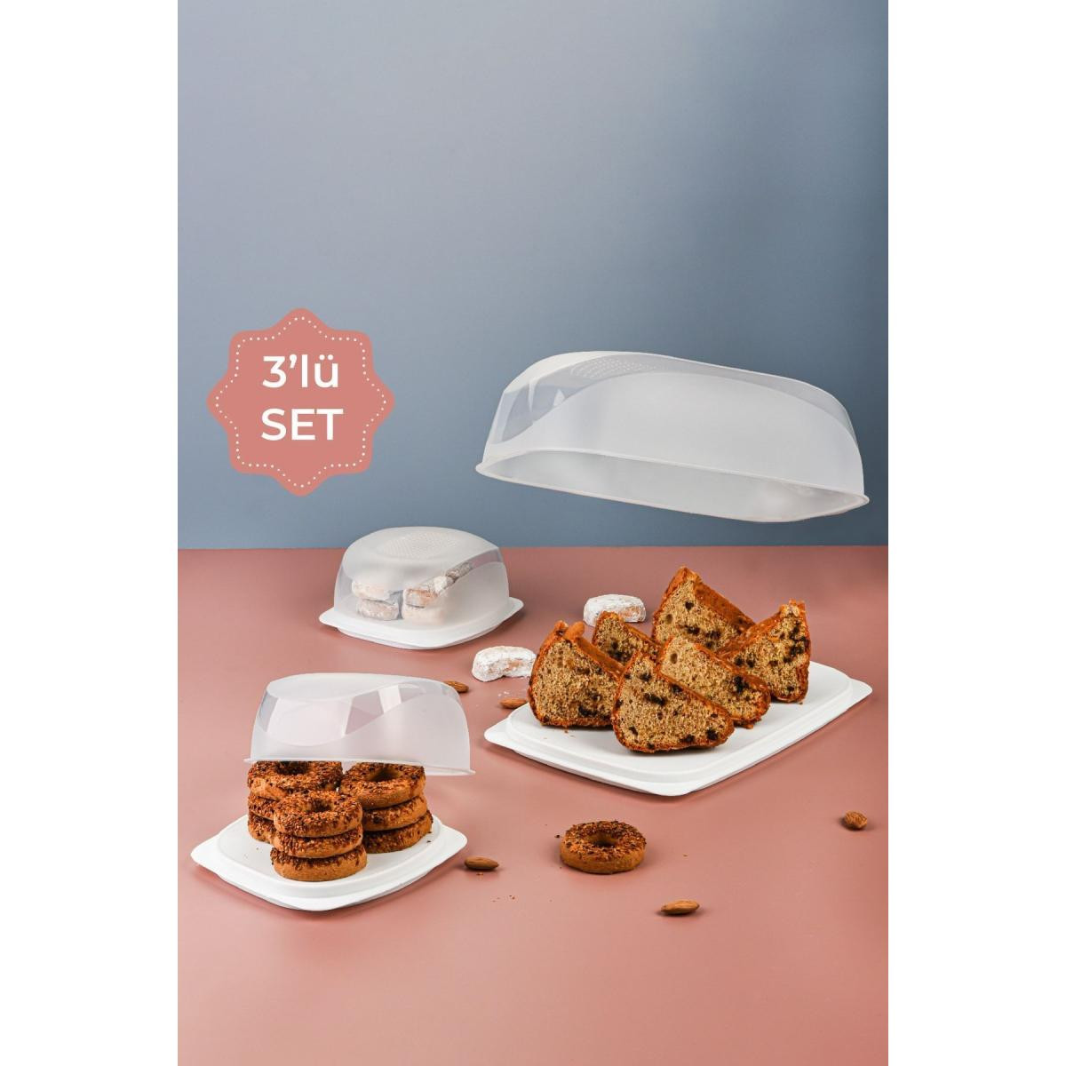 3lü Kapaklı Servis Sunum Tabağı - Ekmeklik ve İkram Tabağı Beyaz Geniş iç alanı sayesinde içinde kek, börek, pasta gibi yiyecekleri muhafaza edebilirsiniz. Kurabiye, kek, börek, peynir gibi gıdalarınızı içinde saklayabilir, ayrıca şık bir şekilde servis edebilirsiniz. Kapaklı yapısı sayesinde ürünlerinizi bayatlamaktan korur, hijyenik bir şekilde muhafaza etmenizi sağlar. Bpa içermez, sağlığa zararlı maddeler içermez. Kapaklıdır. Buzdolabına girebilir. Bulaşık makinesinde yıkanabilir. Ürün Ölçüleri: 30,4 x 20,4 x 9,7 cm
