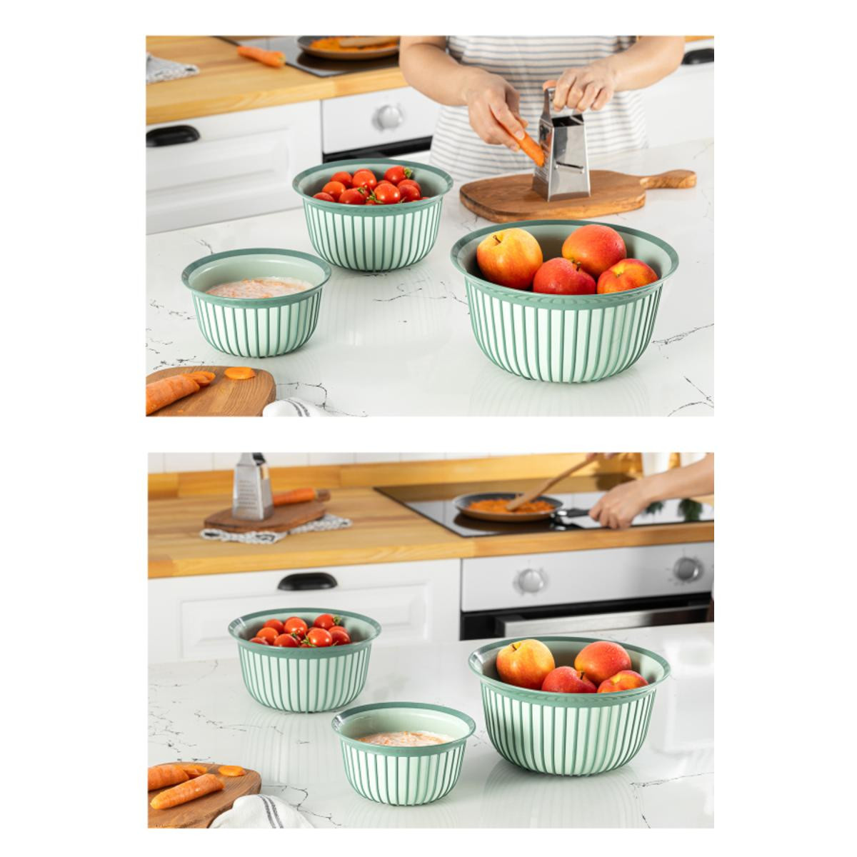 Üçlü kase setleri, mutfakta çok yönlü bir kullanım sunan, genellikle farklı boyutlarda ve şekillerde üç ayrı kaseden oluşan bir ürün grubudur. Bu setler, yemek pişirme, servis yapma ve saklama işlemlerinde oldukça kullanışlıdır. İşte üçlü kase setinin tipik bir ürün açıklaması: Özellikler: Çeşitli Boyutlarda Kaseler: Bu üçlü kase seti, farklı boyutlarda üç ayrı kase içerir. Genellikle büyük, orta ve küçük boyutlarda kaseler sunar, böylece farklı ihtiyaçlarınız için idealdir. Kolay Temizlik: Genellikle bulaşık makinesinde yıkanabilir olan bu kaseler, temizliği kolaydır. Pratik Saklama: Kaseler, birbirine yığılarak saklama işlemini kolaylaştırır ve depolama alanı kazandırır. Kullanım Alanları: Çorba, salata, makarna, meyve, yoğurt ve diğer yiyeceklerin servisi için idealdir. Hamur işleri, yemek pişirme işlemleri ve malzemelerin karıştırılması için kullanılabilir. Buz dolabında veya buzdolabında saklama amaçlı olarak kullanılabilir. Üçlü kase setleri, mutfağınızın temel ekipmanlarından biri olabilir ve yemek hazırlığından servise kadar birçok farklı görevi yerine getirebilir. Estetik tasarımlarıyla sofranıza da şıklık katabilirler. Ürün Ölçüleri: 1 Litre: 16x9 cm 2 Litre: 20x11 cm 3 Litre: 24x13 cm
