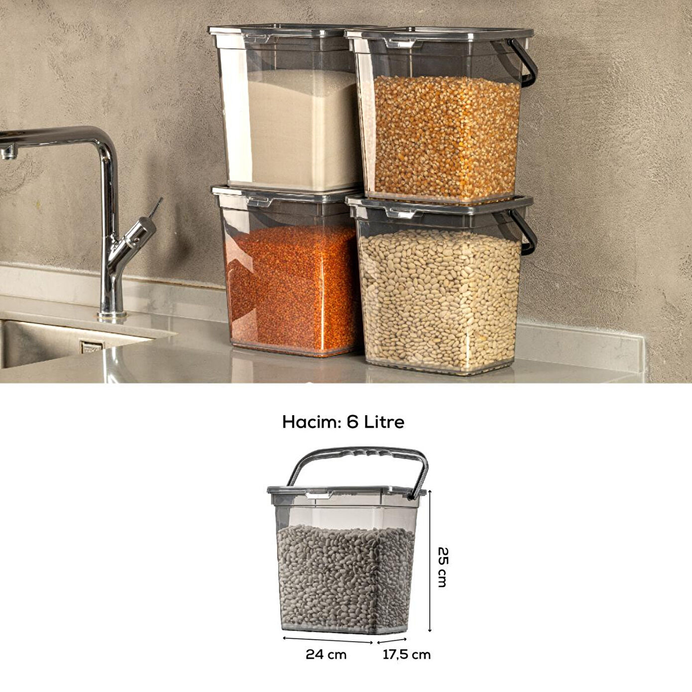 Vienev 4 Adet Kare Un Bakliyat Kabı 6 Litre - Kulplu Deterjanlık Saklama Kutusu Kabı Antrasit