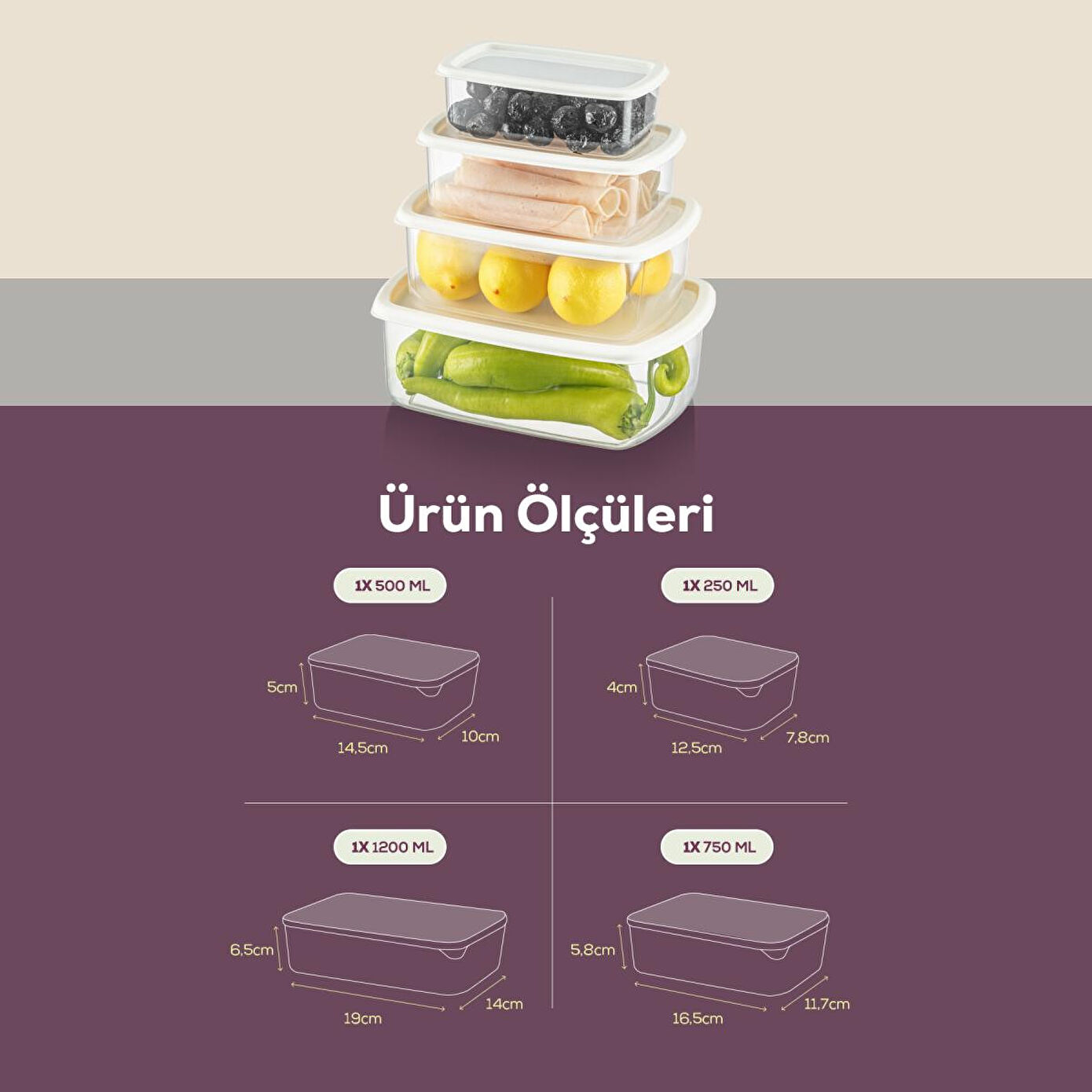 Ürün Hacim ve Ölçüleri: 250 ml: 7,8 x 12,5 x 4 cm ; 500 ml: 10 x 14,5 x 5 cm ; 750 ml: 11,7 x 16,5 x 5,8 cm ; 1200 ml: 14 x 19 x 6,5 cm Özellikler: Hava Geçirmez Kapak: Hava geçirmez kapakları sayesinde içindeki gıdaları uzun süre taze muhafaza edebilirsiniz. İstiflenebilir Tasarım: Sette bulunan her bir saklama kabı, diğerleriyle kolayca üst üste konabilir, böylece dolaplarınızda veya tezgah üstünde az yer kaplar. Çeşitli Boyutlar: Set, farklı boyutlarda saklama kapları içerir, böylece her türlü gıdayı saklamak için uygun bir seçenek bulabilirsiniz. BPA İçermez: Sağlığınızı düşünerek, bu saklama kapları BPA içermeyen malzemelerden üretilmiştir. Kolay Temizlik: Hem elde hem de bulaşık makinesinde kolayca temizlenebilirler. Mutfak düzeninizi sağlayacak bu pratik ve kullanışlı saklama kabı seti ile yemek hazırlama ve saklama işlerinizi keyifle yapabilirsiniz. Optimal saklama koşullarıyla gıdalarınızın tazeliğini koruyun ve mutfakta düzeni sağlayın!