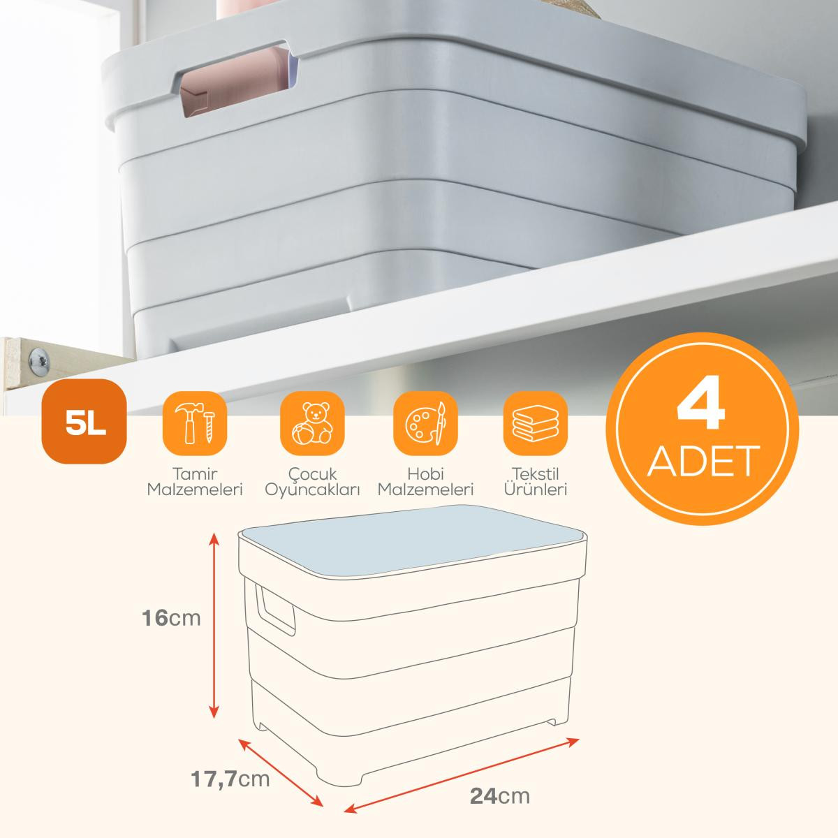 Kompakt ve Fonksiyonel: Hem mutfak dolaplarında hem de banyo, kiler ve çocuk odası gibi alanlarda kullanım için idealdir. Gıdadan kozmetiğe, küçük oyuncaklardan temizlik malzemelerine kadar pek çok ürünü düzenli bir şekilde saklamanıza yardımcı olur. Dayanıklı ve Sağlam Yapı: Yüksek kaliteli, BPA içermeyen plastikten üretilmiştir. Sağlam yapısı sayesinde uzun süreli kullanım sunar. İstiflenebilir Tasarım: Üst üste konulabilir yapısı sayesinde yerden tasarruf sağlar. Dolap içlerini daha verimli kullanmanıza olanak tanır. BPA içermez: Gıda ile temasa uygundur. Taşıma Kolaylığı: Kutunun her iki yanında yer alan ergonomik tutma yerleri ile dolu haldeyken bile rahatça taşınabilir. Ürün Ölçüleri: 17,7x24x16 cm Kapasite: 5 Litre