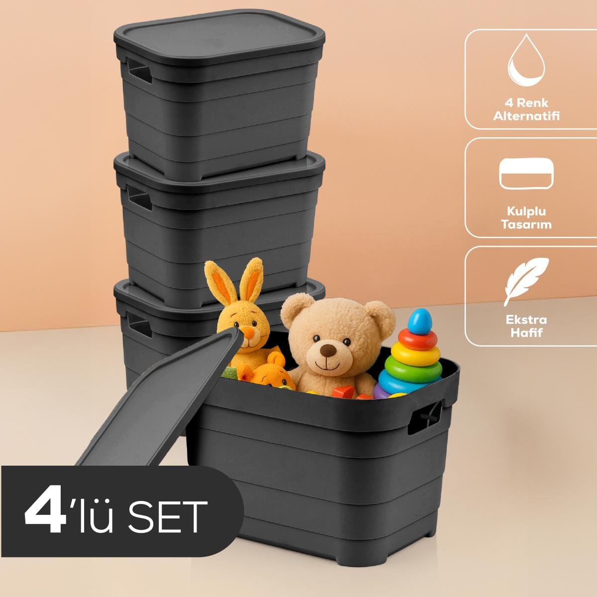 Vienev 4'lü Kapaklı 5 Litre Saklama Kutusu Antrasit
