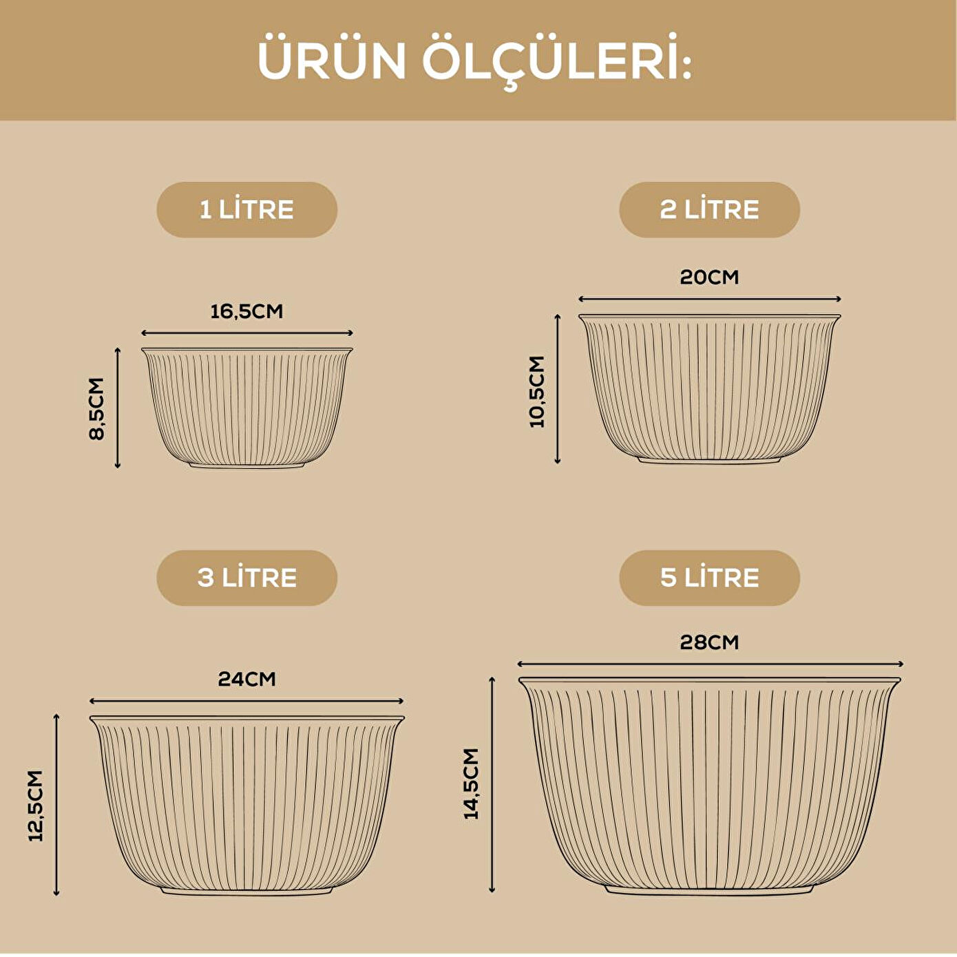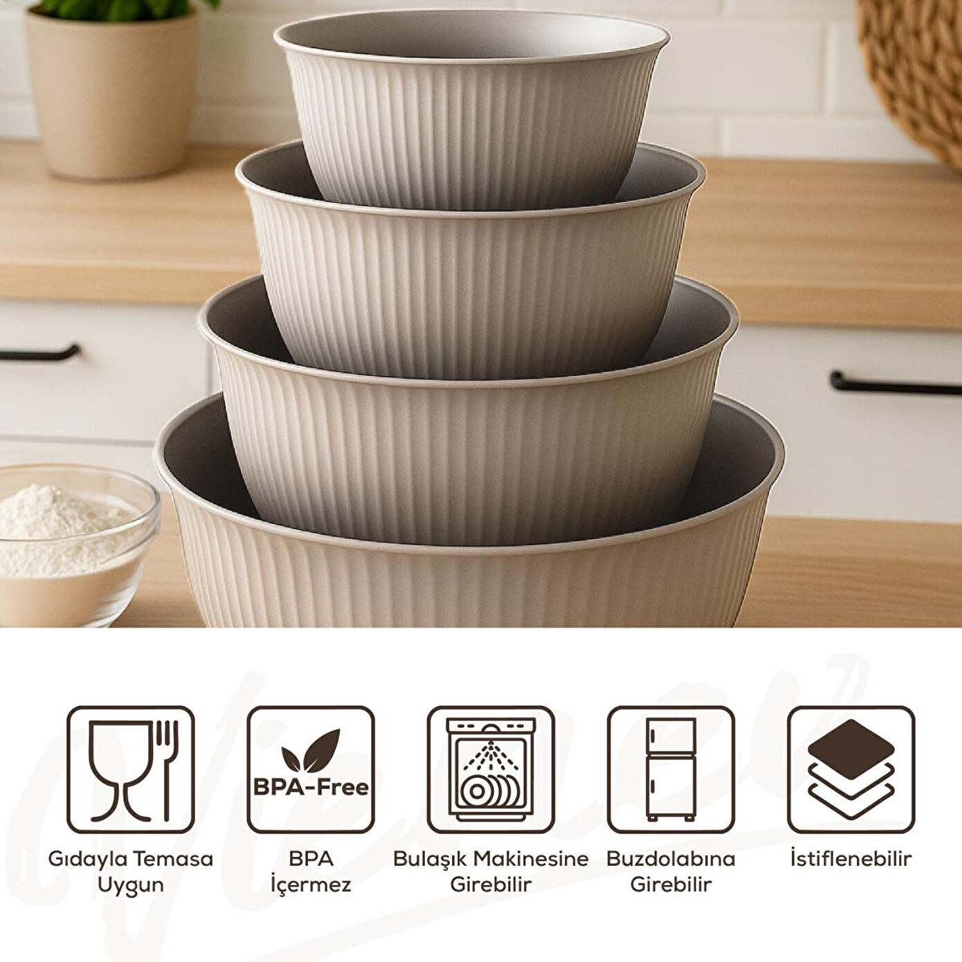 Vienev 4'lü Mega Boy Plastik Karıştırma Ve Saklama Kase Seti | 1l, 2l, 3l, 5l Bej