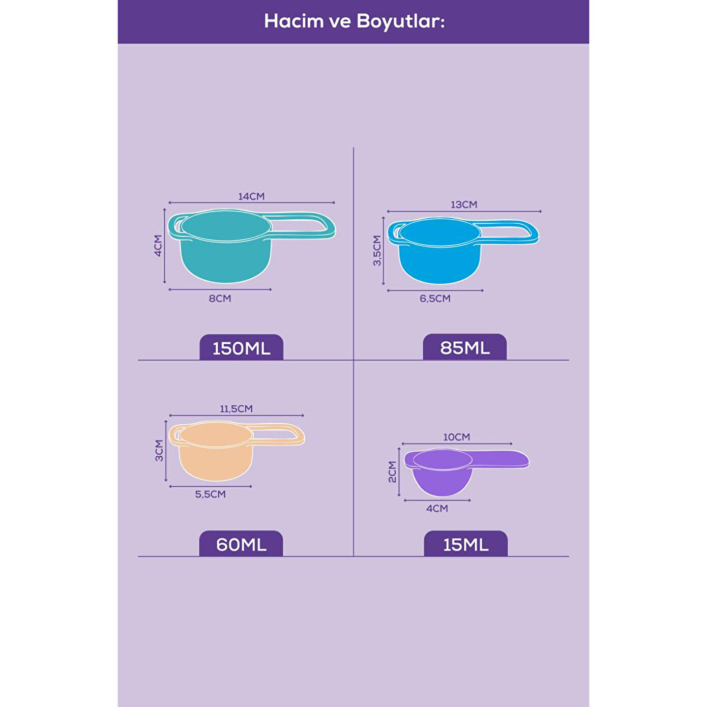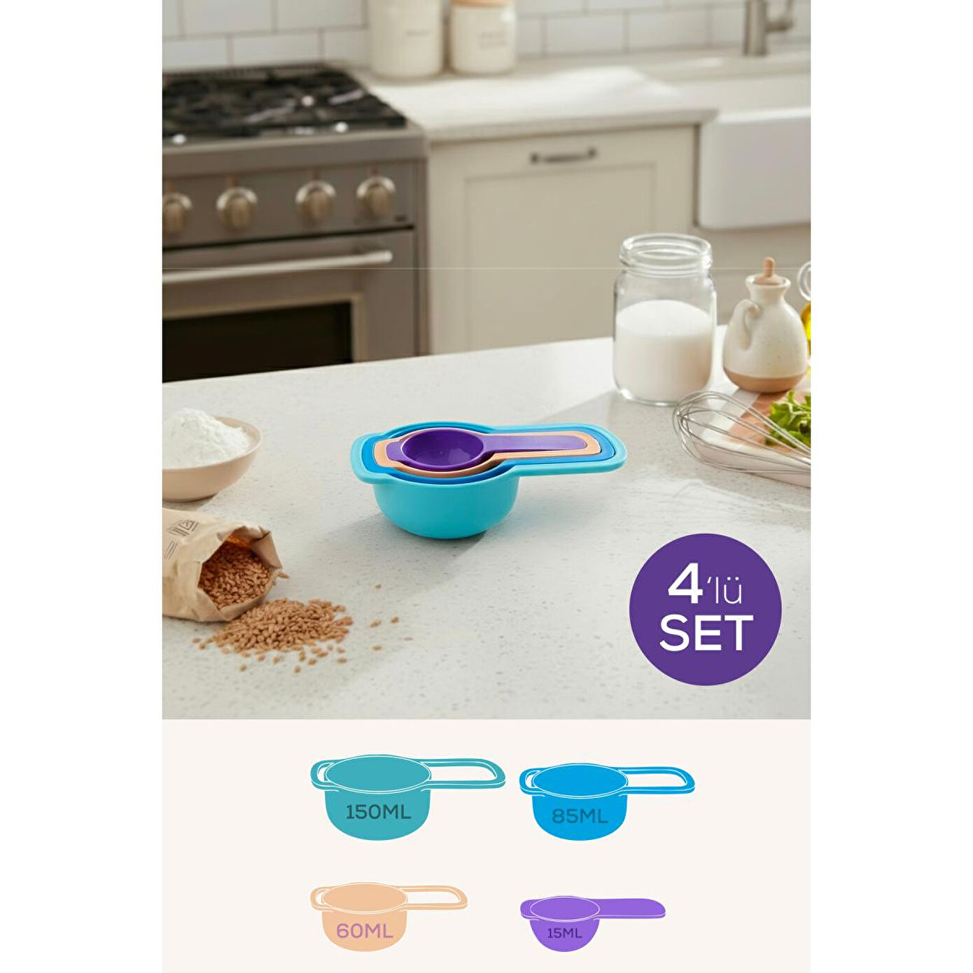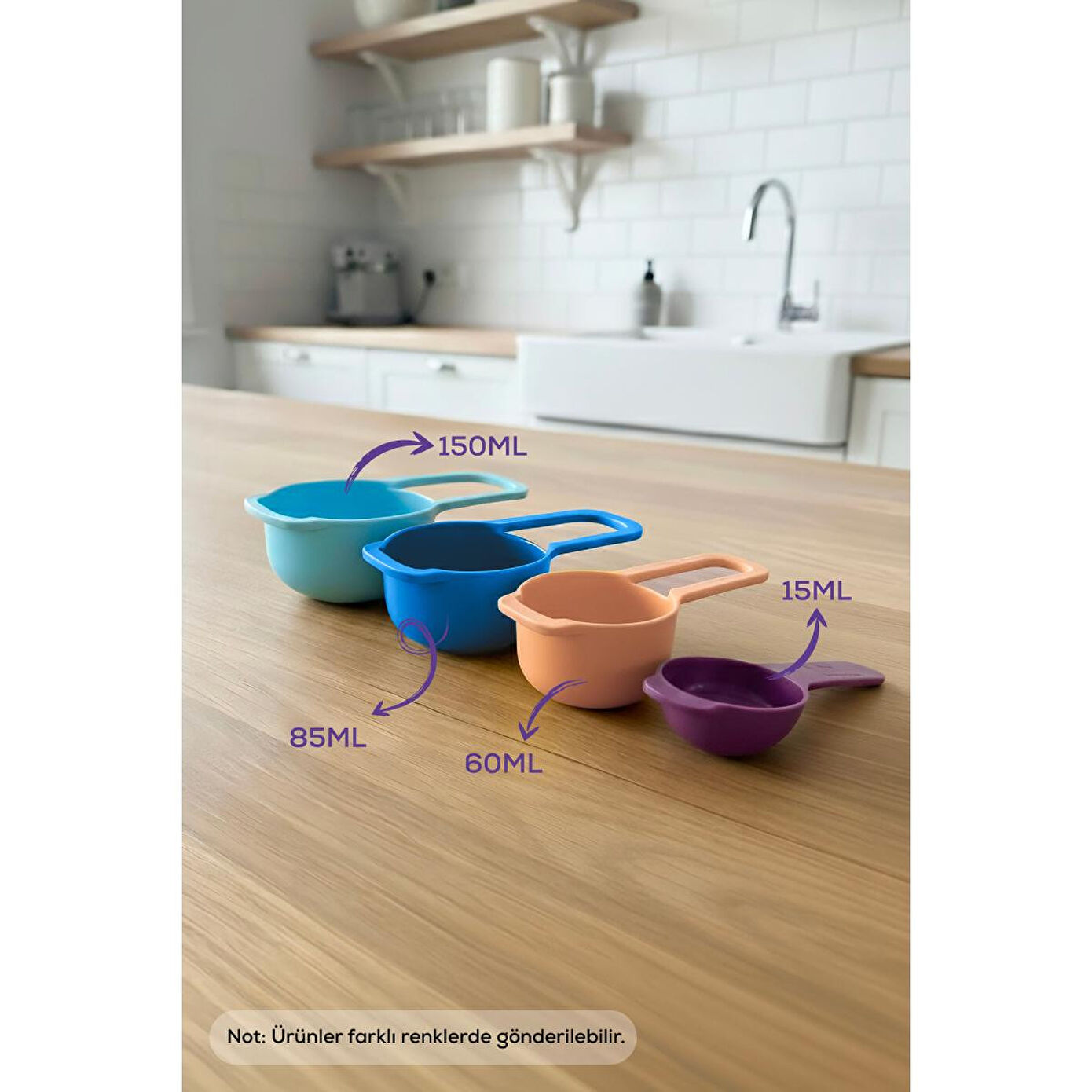 Mutfakta doğru ölçülerle harikalar yaratın! Bu 5’li renkli ölçü kabı seti, hem profesyonel aşçılar hem de evde yemek yapmayı sevenler için mükemmel bir yardımcıdır.; Dayanıklı plastik malzemeden üretilen bu set, farklı hacimlerdeki ölçü kaplarıyla tariflerinizi tam kıvamında hazırlamanızı sağlar.; NOT: Ürün rekleri asorti olarak gönderilecektir.; Set İçeriği ve Ölçüler: 15 ml (1 yemek kaşığı) — 4x10x2 cm 60 ml (1/4 su bardağı) — 5,5x11,5x3 cm 85 ml (1/3 su bardağı) — 6,5x13x3,5 cm 150 ml (2/3 su bardağı) — 8x14x4 cm Özellikler: Canlı renkleriyle mutfağınıza neşe katar Dayanıklı ve hafif plastik malzeme Bulaşık makinesinde yıkanabilir Kolay saklama için iç içe geçebilir tasarım Hamur, tatlı, sos ve içecek tariflerinde hassas ölçüm imkânı Kullanım Alanları: Tatlı yapımı, kahve ölçümü, smoothie tarifleri, un, şeker, yağ ve sıvı ölçümleri için idealdir.;