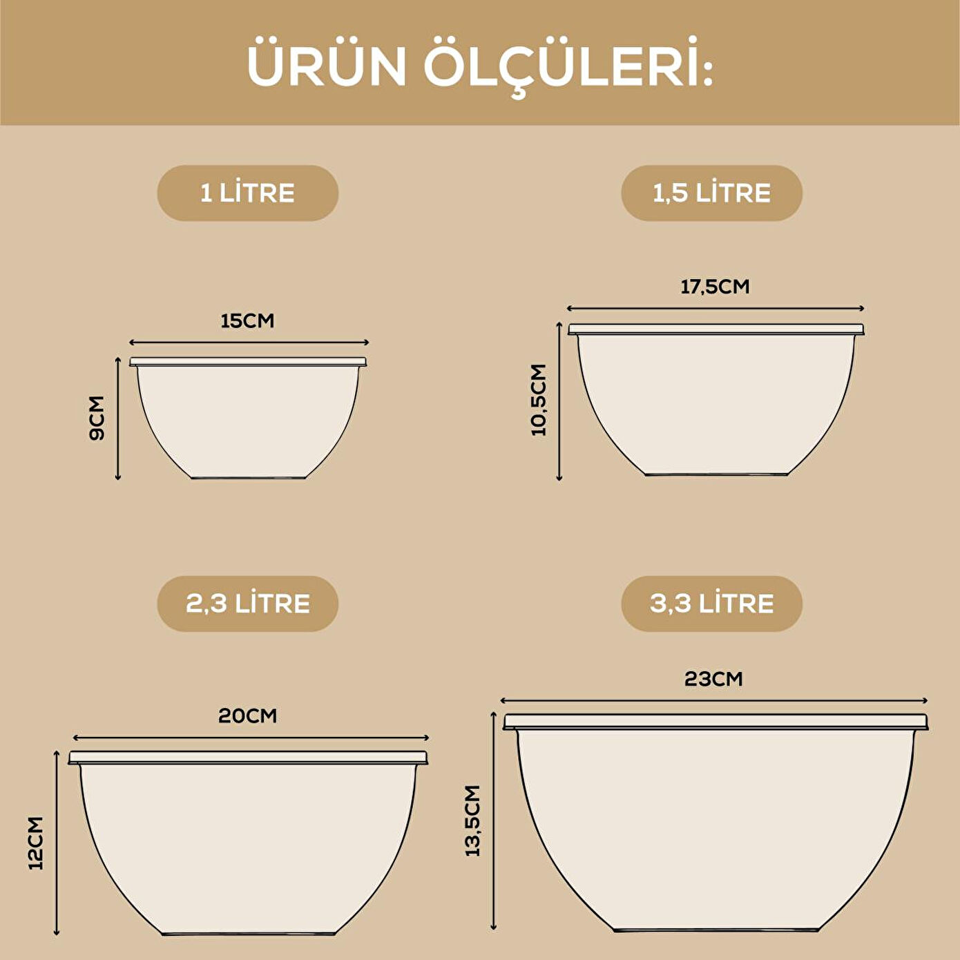 4’lü Yuvarlak Saklama Kabı Seti ( 1L - 1,5L - 2,3L - 3,3L ) Antrasit Kapaklı Gıda Saklama Kabı | Hava Geçirmez | Farklı Boylarda Mutfakta pratikliği ve düzeni bir araya getiren bu 4’lü saklama kabı seti, farklı boyutlardaki hacimleri sayesinde tüm gıda saklama ihtiyaçlarınıza çözüm sunar. Artan yemekler, salatalar, meyveler veya kuru bakliyatlar için ideal; modern tasarımıyla dolaplarınızda da estetik bir görünüm yaratır. Set İçeriği ve Ürün Ölçüleri: 1 Litre: 16 cm çap x 8,5 cm yükseklik 1,5 Litre: 17,6 cm çap x 9,5 cm yükseklik 2,3 Litre: 20 cm çap x 11 cm yükseklik 3,3 Litre: 23 cm çap x 12,5 cm yükseklik Ürün Özellikleri: Malzeme: BPA içermeyen, gıdaya uygun plastik Kapak Tipi: Esnek, şeffaf ve sıkı kapanan kapak – hava geçirmez yapı Renk: Antrasit gri gövde Kullanım Alanları: Buzdolabı, derin dondurucu, kuru gıda saklama, artan yemek muhafazası Tasarım: İç içe geçerek yer kaplamaz, kolayca istiflenebilir Avantajları: 4 farklı boy ile çok yönlü kullanım Tazelik koruyan kapak tasarımı Modern ve sade görünüm Kolay temizlenir, bulaşık makinesine uygundur Hafif ve dayanıklı yapı Günlük mutfak ihtiyaçlarını karşılamak ve gıdalarınızı taze tutmak için pratik bir çözüm arıyorsanız, bu 4’lü saklama kabı seti tam size göre!