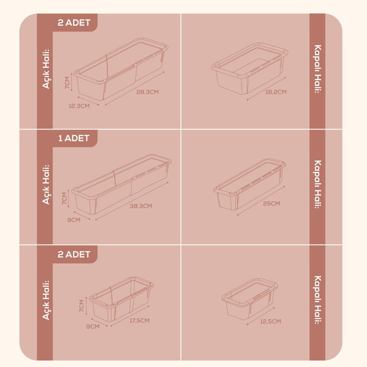 Makyaj malzemeleriniz, bakım ürünleriniz, ofis gereçleriniz veya mutfak araçlarınız artık dağınıklık yaratmasın! Vienev Ayarlanabilir Çekmece İçi Düzenleyici Kutular, farklı boy seçenekleriyle her ihtiyaca uyum sağlayan, modüler tasarımlı organizer çözümüdür. Boy Seçenekleri: No:1 – Dar Kısa: Sünger, toka, yüzük, ruj gibi küçük aksesuarlar için idealdir. Kompakt yapısıyla dar alanlarda bile işlevsellik sunar. Boyut: 9x12,5x7 cm ; Açık Hali: 9x17,5x7 cm No:2 – Geniş Kısa: Maskara, göz kalemi, kaş fırçası gibi uzun ama dar malzemeler için uygundur. Çekmecelerde yer tasarrufu sağlar. Boyut: 12,3x18,2x7 cm ; Açık Hali: 12,3x28,3x7 cm No:3 – Dar Uzun: Fırça setleri, paletler, taraklar gibi orta ebatlı ürünler için mükemmel çözüm sunar. Boyut: 9x25x7 cm ; Açık Hali: 9x38,3x7 cm No:4 – Geniş Uzun: Krem kavanozları, şişeler, spreyler gibi büyük hacimli ürünlerin güvenle saklanmasını sağlar. Boyut: 18,5x24,2x7 cm ; Açık Hali: 18,5x38x7 cm Özellikler: Sağlam Malzeme: Yüksek kaliteli plastikten üretilmiştir, uzun ömürlü ve temizliği kolaydır. Her Alana Uyumlu: Mutfak, banyo, makyaj masası, ofis çekmeceleri gibi birçok alanda kullanıma uygundur. Minimal ve Şık Görünüm: Nötr krem rengi, her dekorasyon stiline uyum sağlar.