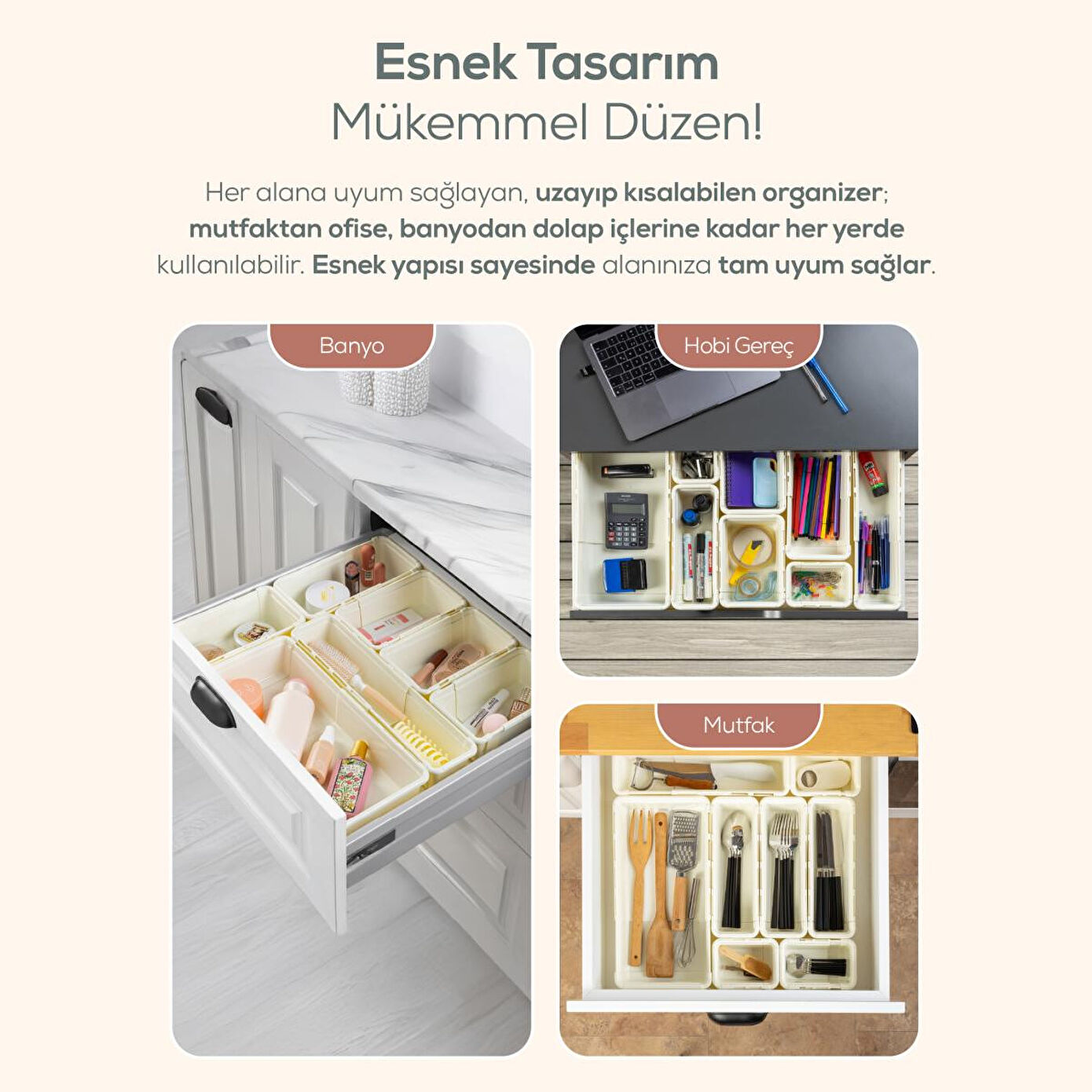Makyaj malzemeleriniz, bakım ürünleriniz, ofis gereçleriniz veya mutfak araçlarınız artık dağınıklık yaratmasın! Vienev Ayarlanabilir Çekmece İçi Düzenleyici Kutular, farklı boy seçenekleriyle her ihtiyaca uyum sağlayan, modüler tasarımlı organizer çözümüdür. Boy Seçenekleri: No:1 – Dar Kısa: Sünger, toka, yüzük, ruj gibi küçük aksesuarlar için idealdir. Kompakt yapısıyla dar alanlarda bile işlevsellik sunar. Boyut: 9x12,5x7 cm ; Açık Hali: 9x17,5x7 cm No:2 – Geniş Kısa: Maskara, göz kalemi, kaş fırçası gibi uzun ama dar malzemeler için uygundur. Çekmecelerde yer tasarrufu sağlar. Boyut: 12,3x18,2x7 cm ; Açık Hali: 12,3x28,3x7 cm No:3 – Dar Uzun: Fırça setleri, paletler, taraklar gibi orta ebatlı ürünler için mükemmel çözüm sunar. Boyut: 9x25x7 cm ; Açık Hali: 9x38,3x7 cm No:4 – Geniş Uzun: Krem kavanozları, şişeler, spreyler gibi büyük hacimli ürünlerin güvenle saklanmasını sağlar. Boyut: 18,5x24,2x7 cm ; Açık Hali: 18,5x38x7 cm Özellikler: Sağlam Malzeme: Yüksek kaliteli plastikten üretilmiştir, uzun ömürlü ve temizliği kolaydır. Her Alana Uyumlu: Mutfak, banyo, makyaj masası, ofis çekmeceleri gibi birçok alanda kullanıma uygundur. Minimal ve Şık Görünüm: Nötr krem rengi, her dekorasyon stiline uyum sağlar.