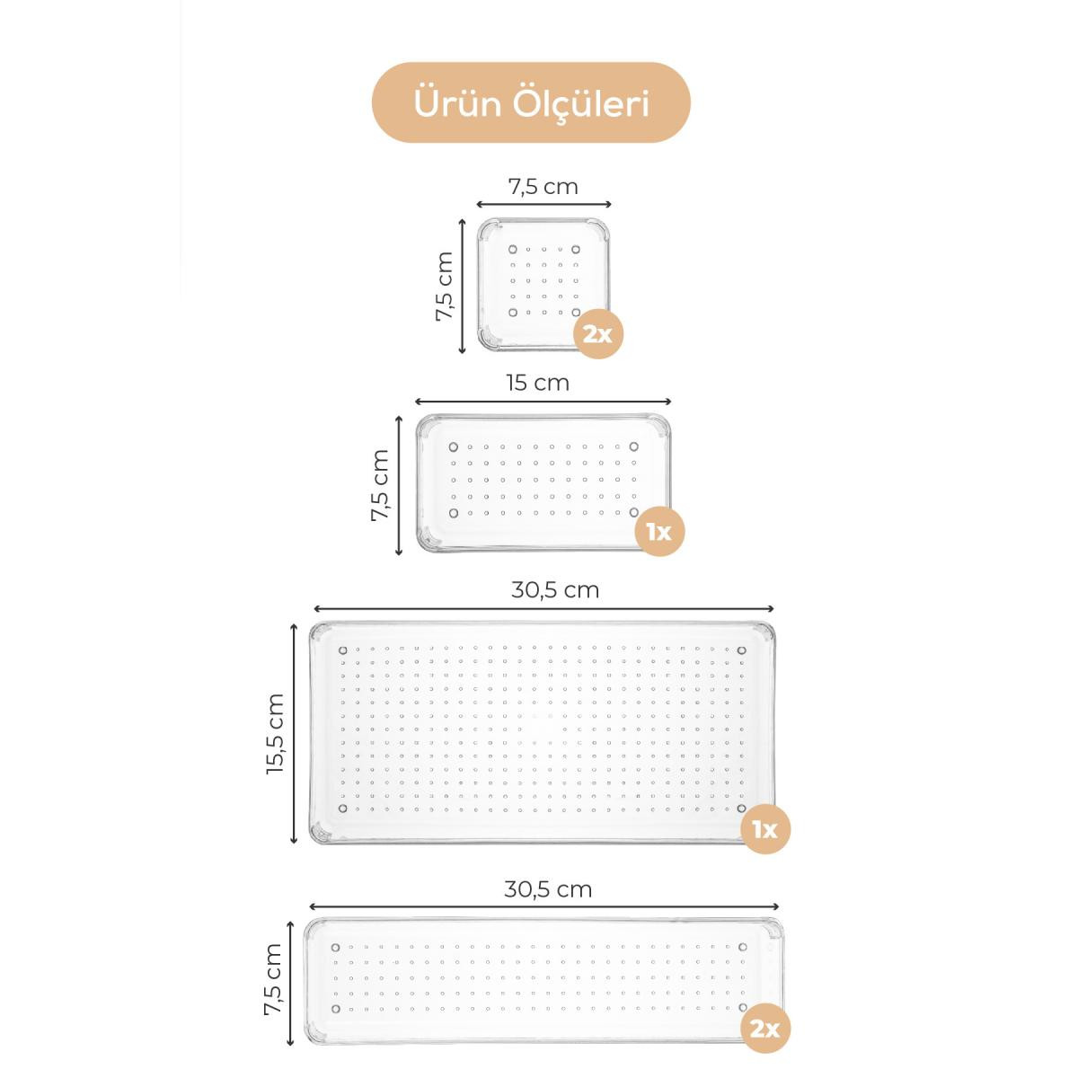 Küçük Kare: 7,5x7,5x5,5 cm / Hacim: 250 ml ; Dar Dikdörtgen: 30,5x7,5x5,5 cm / Hacim: 1,1 Litre ; Büyük Dikdörtgen: 30,5x15,5x5,5 cm / Hacim: 2,2 Litre ; Küçük Dikdörtgen: 15x7,5x5,5 cm / Hacim: 500 ml ; ; Kolay Erişim: Organizatörler, çekmece içindeki eşyalara kolay erişim sağlar.; Her şeyi bir arada tutarak, istediğiniz şeyi hızlıca bulabilirsiniz.; ; ; Çeşitli Boyutlar: Çekmece düzenleyici organizerler, farklı boyutlarda gelir.; Bu nedenle, çekmeceye sığdırmak istediğiniz eşyaların türüne ve miktarına göre seçim yapabilirsiniz.; ; ; Çeşitli Kullanım Alanları: Bu organizatörler, mutfak çekmecelerini bıçaklar, çatallar ve kaşıklarla düzenlemekten, ofis çekmecelerini kalem, not kağıdı ve ofis malzemeleri ile düzenlemeye kadar pek çok farklı alanda kullanılabilirler.; ; ; Temizlik Kolaylığı: Organizatörler, çekmecelerin temiz tutulmasına yardımcı olur.; Eşyaların düzenli bir şekilde yerleştirilmesi, çekmecenin temizlenmesini kolaylaştırır.; ; ; Düzen: Çekmece düzenleyici organizerler, her alanında kullanılabilir.; Gardırop düzenlemek, banyo malzemelerini düzenlemek veya mutfak eşyalarını düzenlemek için idealdirler.