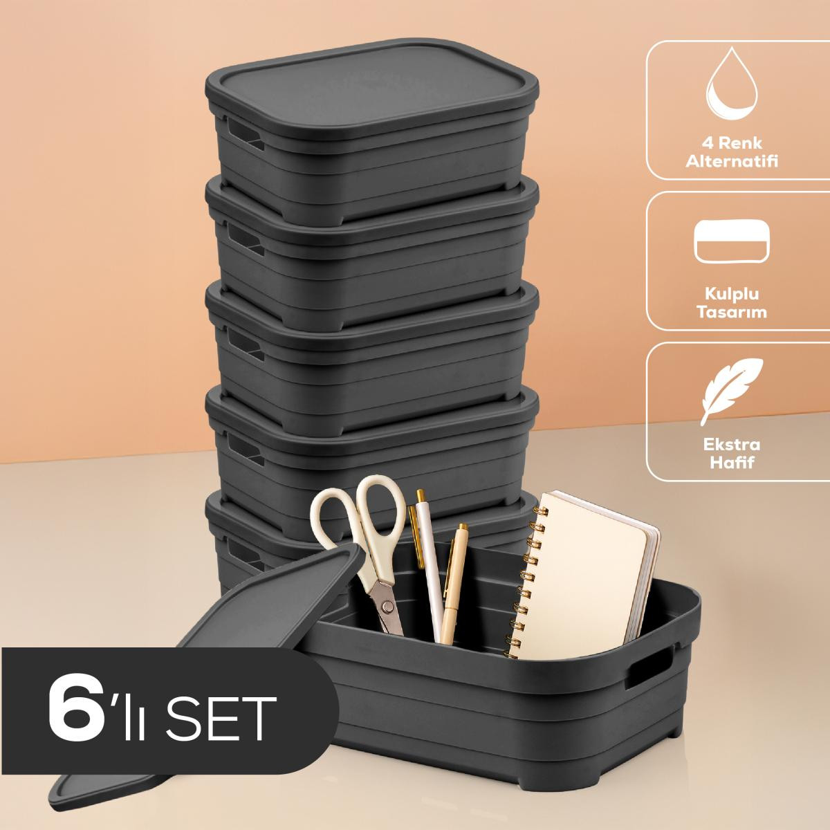 Vienev 6'lı Kapaklı 2,8 Litre Saklama Kutusu Antrasit
