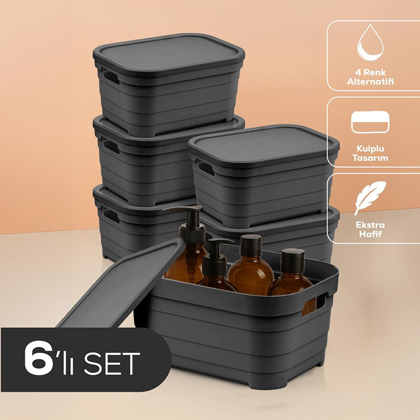 Vienev 6'lı Kapaklı 3,8 Litre Saklama Kutusu Antrasit