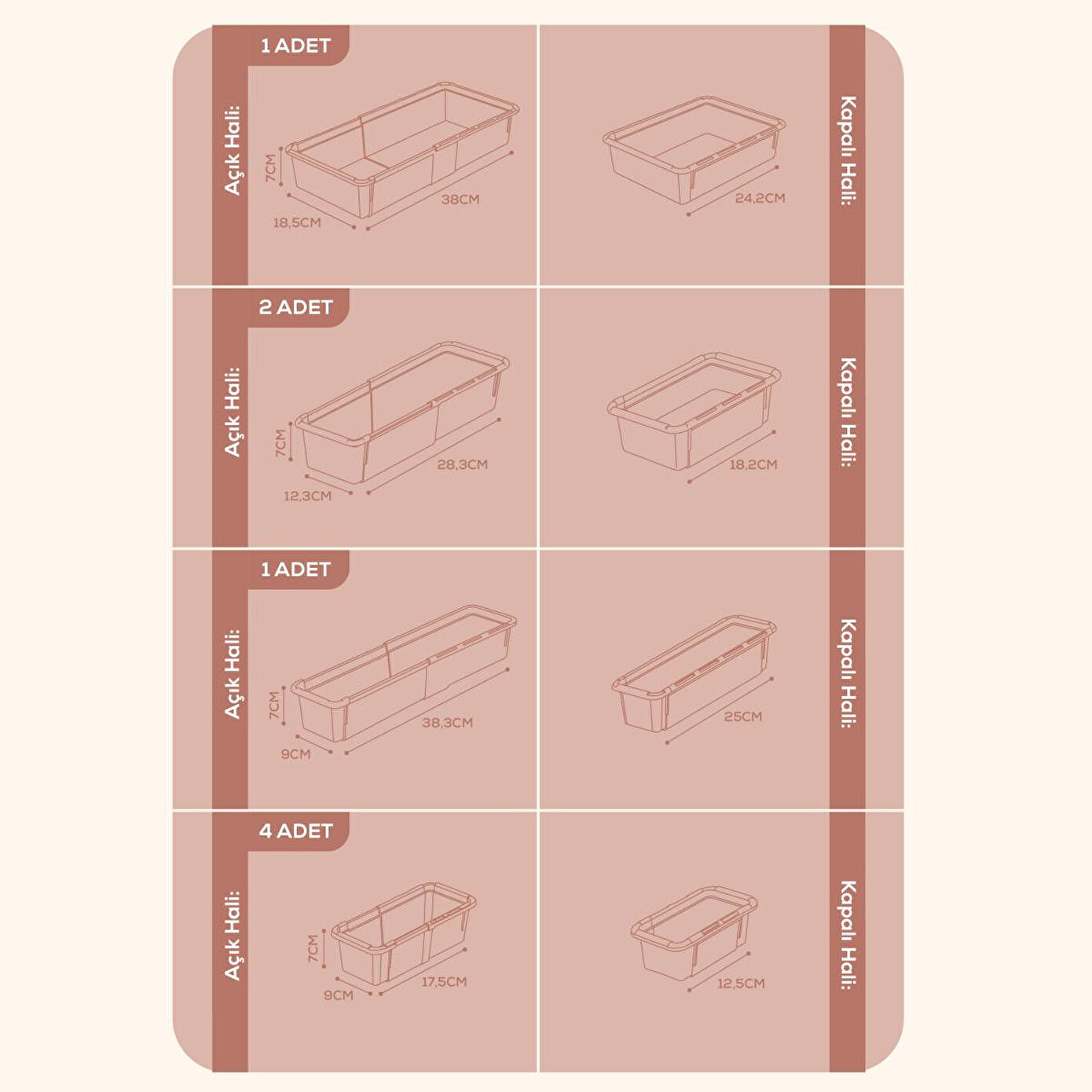 Makyaj malzemeleriniz, bakım ürünleriniz, ofis gereçleriniz veya mutfak araçlarınız artık dağınıklık yaratmasın! Vienev Ayarlanabilir Çekmece İçi Düzenleyici Kutular, farklı boy seçenekleriyle her ihtiyaca uyum sağlayan, modüler tasarımlı organizer çözümüdür. Boy Seçenekleri: No:1 – Dar Kısa: Sünger, toka, yüzük, ruj gibi küçük aksesuarlar için idealdir. Kompakt yapısıyla dar alanlarda bile işlevsellik sunar. Boyut: 9x12,5x7 cm ; Açık Hali: 9x17,5x7 cm No:2 – Geniş Kısa: Maskara, göz kalemi, kaş fırçası gibi uzun ama dar malzemeler için uygundur. Çekmecelerde yer tasarrufu sağlar. Boyut: 12,3x18,2x7 cm ; Açık Hali: 12,3x28,3x7 cm No:3 – Dar Uzun: Fırça setleri, paletler, taraklar gibi orta ebatlı ürünler için mükemmel çözüm sunar. Boyut: 9x25x7 cm ; Açık Hali: 9x38,3x7 cm No:4 – Geniş Uzun: Krem kavanozları, şişeler, spreyler gibi büyük hacimli ürünlerin güvenle saklanmasını sağlar. Boyut: 18,5x24,2x7 cm ; Açık Hali: 18,5x38x7 cm Özellikler: Sağlam Malzeme: Yüksek kaliteli plastikten üretilmiştir, uzun ömürlü ve temizliği kolaydır. Her Alana Uyumlu: Mutfak, banyo, makyaj masası, ofis çekmeceleri gibi birçok alanda kullanıma uygundur. Minimal ve Şık Görünüm: Nötr krem rengi, her dekorasyon stiline uyum sağlar.