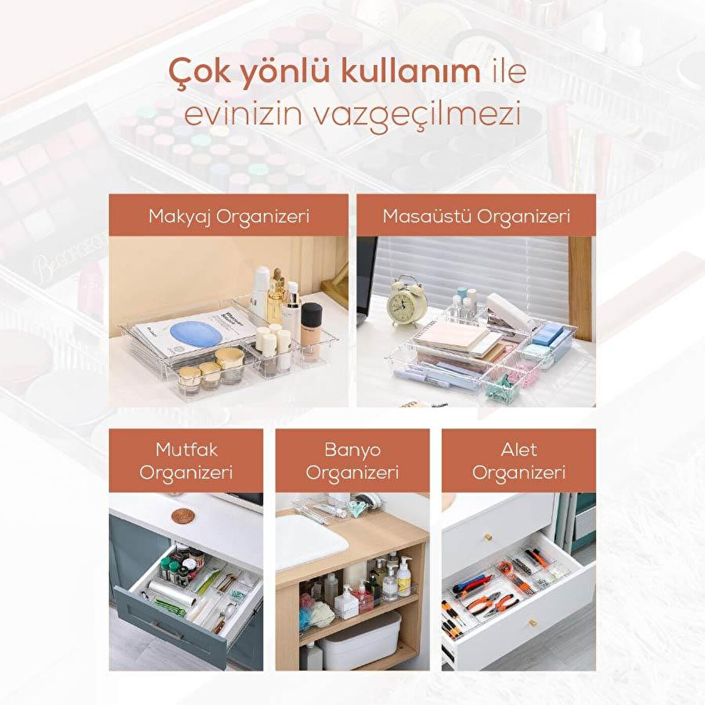 Çekmece düzenleyici organizerler, çekmeceleri düzenlemek ve eşyaları daha düzenli bir şekilde saklamak için kullanılan kullanışlı araçlardır. Bu organizatörler, ev, ofis veya garaj gibi farklı alanlarda kullanılabilir ve çekmecelerin içindeki karmaşıklığı azaltmaya yardımcı olur. ; Düzeni Sağlar: Çekmece düzenleyici organizerler, çekmeceleri düzenlemek ve içindeki eşyaları belirli bir düzene koymak için kullanılır. Bu düzen, eşyalarınızın kolayca bulunmasını sağlar ve gereksiz karmaşıklığı ortadan kaldırır. ; Ürün Ölçüleri: ; Büyük Dikdörtgen: 30,5x15,5x5,5 cm ; Küçük Dikdörtgen: 15x7,5x5,5 cm ; Dar Dikdörtgen:30,5x7,5x5,5 cm ; Büyük Kare:15x15x5 cm ; Küçük Kare: 7,5x7,5x5,5 cm ; Kolay Erişim: Organizatörler, çekmece içindeki eşyalara kolay erişim sağlar. Her şeyi bir arada tutarak, istediğiniz şeyi hızlıca bulabilirsiniz. ; ; Çeşitli Boyutlar: Çekmece düzenleyici organizerler, farklı boyutlarda gelir. Bu nedenle, çekmeceye sığdırmak istediğiniz eşyaların türüne ve miktarına göre seçim yapabilirsiniz. ; ; Çeşitli Kullanım Alanları: Bu organizatörler, mutfak çekmecelerini bıçaklar, çatallar ve kaşıklarla düzenlemekten, ofis çekmecelerini kalem, not kağıdı ve ofis malzemeleri ile düzenlemeye kadar pek çok farklı alanda kullanılabilirler. ; ; Temizlik Kolaylığı: Organizatörler, çekmecelerin temiz tutulmasına yardımcı olur. Eşyaların düzenli bir şekilde yerleştirilmesi, çekmecenin temizlenmesini kolaylaştırır. ; ; Ev Düzeni: Çekmece düzenleyici organizerler, evin her alanında kullanılabilir. Gardırop düzenlemek, banyo malzemelerini düzenlemek veya mutfak eşyalarını düzenlemek için idealdirler. ;
