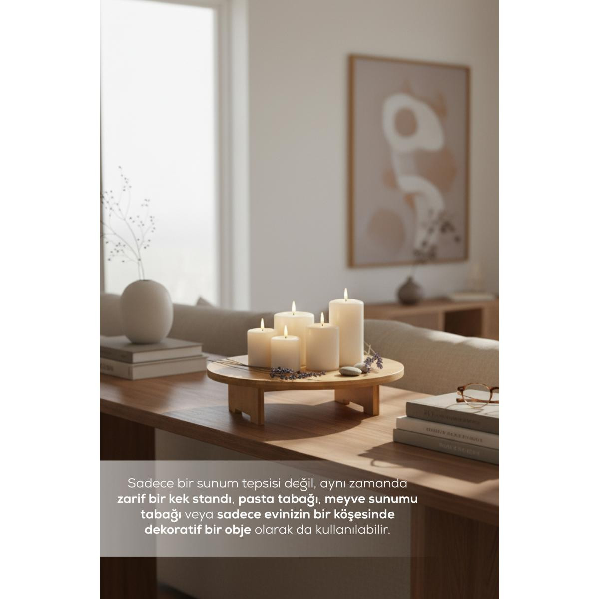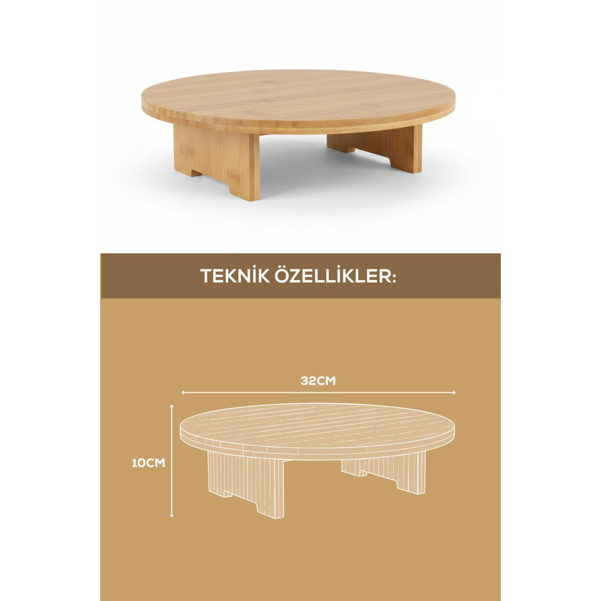 Sofralarınıza ve sunumlarınıza doğal bir dokunuş katmak istiyorsanız, bu çok amaçlı servis tepsisi tam size göre! Hem estetik hem de işlevsel tasarımıyla mutfağınızın ve evinizin vazgeçilmez bir parçası olacak.; ; ; Bu yuvarlak ahşap tepsi, sade ve modern çizgileri sayesinde her türlü dekorasyon stiline mükemmel uyum sağlar.; Kahvaltı sofralarından özel davetlere, tüm ikramlarınızı şık bir şekilde sunmanıza olanak tanır.; ; ; Ürünün Öne Çıkan Özellikleri ; Malzeme: %100 doğal ve dayanıklı ahşaptan üretilmiştir.; Sağlıklı, çevre dostu ve uzun ömürlü bir kullanım sunar.; ; ; Boyutlar: 32 cm çapı ve 10 cm yüksekliği ile geniş bir kullanım alanı sağlar.; Ayaklı yapısı sayesinde masanızda fazla yer kaplamadan şık bir duruş sergiler.; ; ; Çok Yönlü Kullanım: Sadece bir sunum tepsisi değil, aynı zamanda zarif bir kek standı, pasta tabağı, meyve sunumu tabağı veya sadece evinizin bir köşesinde dekoratif bir obje olarak da kullanılabilir.; ; ; Tasarım: Minimalist ve ayaklı tasarımı, sunumlarınızı daha belirgin ve etkileyici hale getirir.; Hem modern hem de klasik mutfaklarda rahatlıkla kullanılabilir.; ; ; Kolay Bakım: Nemli bir bezle silerek kolayca temizlenebilir.; Ürünün ömrünü uzatmak için suyla uzun süreli temasından kaçınmanız önerilir.; ;