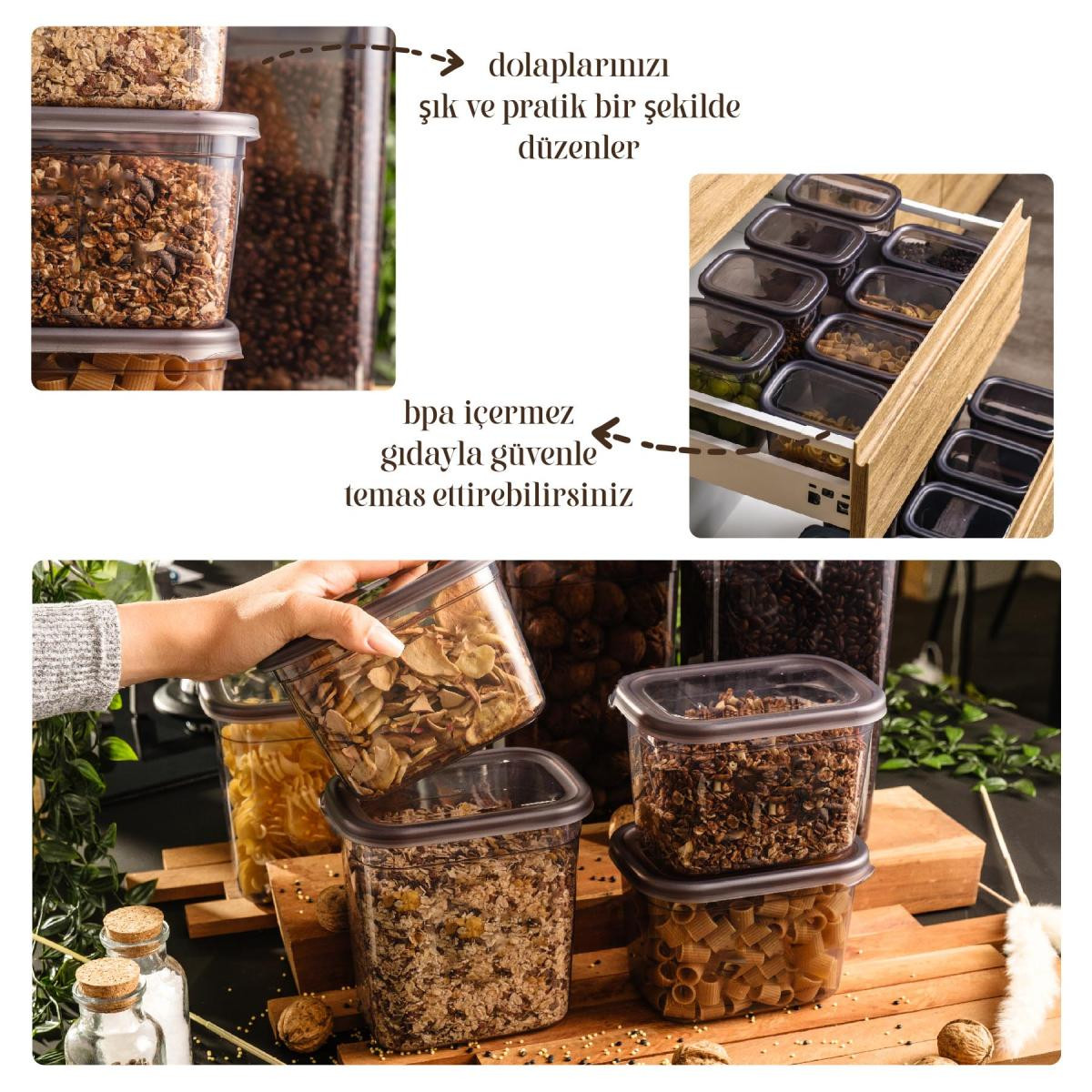 Dayanıklı plastik malzemeden üretilmiş olup, uzun ömürlü kullanım sunar; 5 farklı boyutta (1500 ml, 1150 ml ve 800 ml) tasarlanmış olup, çeşitli eşyalarınızı düzenli bir şekilde saklamanızı sağlar; Şık antrasit rengiyle mutfak dekorasyonunuza modern bir dokunuş katar; Serigrafi etiketleme özelliği sayesinde içeriklerinizi kolayca tanımlayabilir ve etiketleme ihtiyacını ortadan kaldırabilirsiniz;