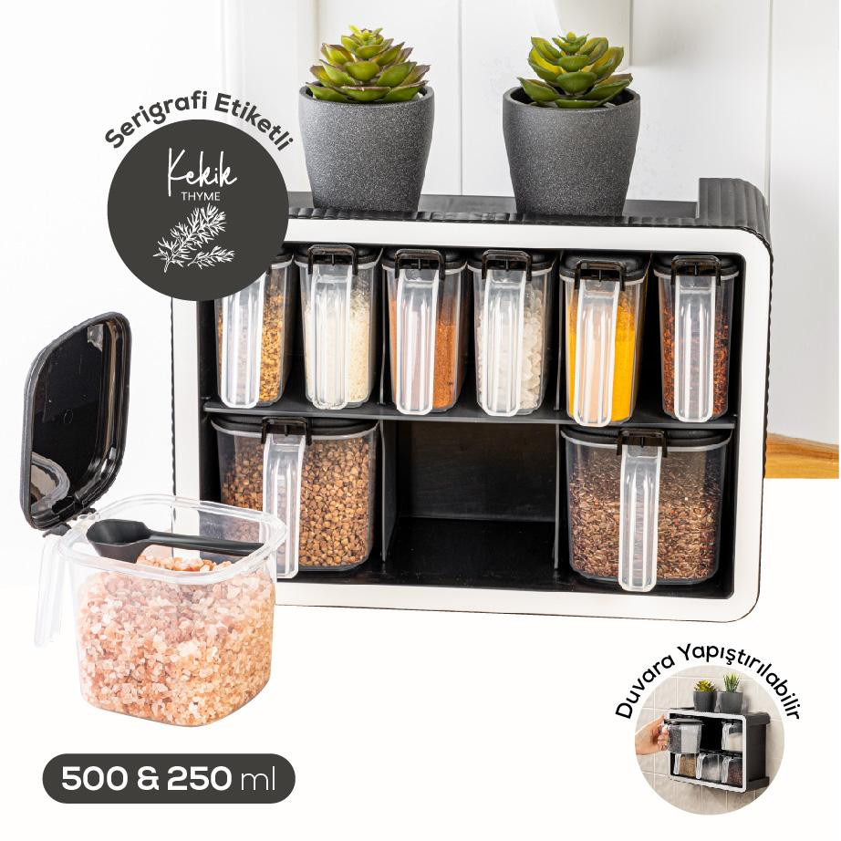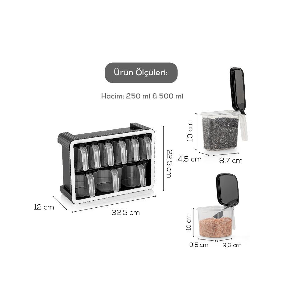 Mutfak Düzeninin Şıklığı ve Pratikliği ; ; Mutfakta en çok ihtiyaç duyulan malzemelerden olan baharatları, şık ve düzenli bir şekilde saklayabileceğiniz bu 12’li Standlı Kendinden Kaşıklı Baharatlık Seti, kullanışlı ve yenilikçi tasarımıyla öne çıkıyor.; Baharatlarınızı hem düzenli tutmak hem de kolay erişilebilir kılmak için özel olarak tasarlanmış bu set, modern mutfaklara şıklık katarken pratik kullanımıyla da mutfak işlerinizi hızlandırır.; ; ; Öne Çıkan Özellikler: ; Baharat Haznesi: Set içerisinde bulunan kaplar, mutfağınızda sıkça kullandığınız tüm baharatları rahatlıkla organize etmenizi sağlar.; Farklı baharatlar için yeterli kapasite sunan bu hazneler, günlük mutfak kullanımında kolaylık sağlar.; ; ; Kendinden Kaşıklı Kapaklar: Her bir haznenin içinde sabitlenmiş kaşıklar sayesinde, baharatları ölçerken ekstra bir kaşık kullanmanıza gerek kalmaz.; Kapakla entegre olan kaşıklar pratiklik sunar ve kaşığı sürekli temiz tutar.; ; ; Duvara Yapıştırılabilir Stand: Yer tasarrufu sağlamak amacıyla özel olarak tasarlanan bu stand, duvara kolayca yapıştırılarak monte edilebilir.; Böylece tezgah üstünde ekstra alan açar ve mutfağınıza minimalist bir düzen getirir.; ; ; Şeffaf Tasarım: Baharat kaplarının şeffaf yapısı sayesinde hangi kapta hangi baharat olduğunu kolayca görebilirsiniz.; Bu da kullanım esnasında zamandan tasarruf etmenize yardımcı olur.; ; ; Dayanıklı ve BPA İçermeyen Malzeme: Yüksek kaliteli, dayanıklı plastikten üretilmiş olan bu set, uzun ömürlü kullanım için idealdir.; BPA içermeyen malzemesi ile sağlıklı bir mutfak deneyimi sunar.; ; ; Kolay Temizlenebilir: Kaplar ve kaşıklar, kolayca çıkarılabilir ve elde ya da bulaşık makinesinde rahatlıkla temizlenebilir.; ; ; Modern ve Şık Tasarım: Estetik açıdan göze hitap eden bu baharatlık seti, mutfak dekorunuza şıklık katar.; Modern mutfaklara uyum sağlayan zarif tasarımı ile dikkat çeker.; ; ; Ürün Boyutları: ; Stand: 32,5x12 cm Yükseklik: 22,5 cm ; Baharat Kapları: ; 250 ml: 4,5x10x8,7 cm ; 500 ml: 9,5x10x9,3 cm ; Kullanım Alanları: ; Baharatlarınızı düzenli bir şekilde saklamak ve organize etmek için mutfağınızda kullanabilirsiniz.; ; İsteğe bağlı olarak, farklı kuruyemişler, çay, kahve gibi malzemeler için de uygundur.; ; Kurulum ve Kullanım Talimatları: ; Duvara monte etmek için paket içindeki yapışkan bandı kullanarak stantı uygun bir yüzeye yapıştırın.; ; Baharat haznelerini stanta yerleştirin ve kullanıma hazır hale getirin.; ; Kapaklardaki entegre kaşıklar sayesinde, her kullanımdan sonra kaşığı kolayca yerine yerleştirebilirsiniz.