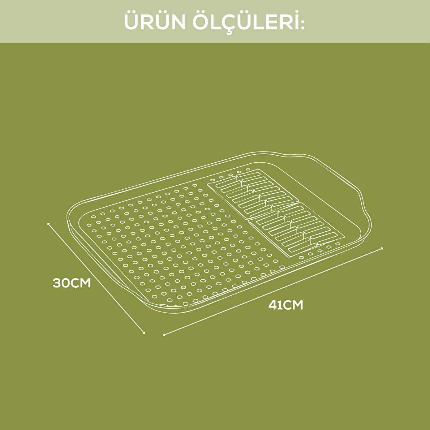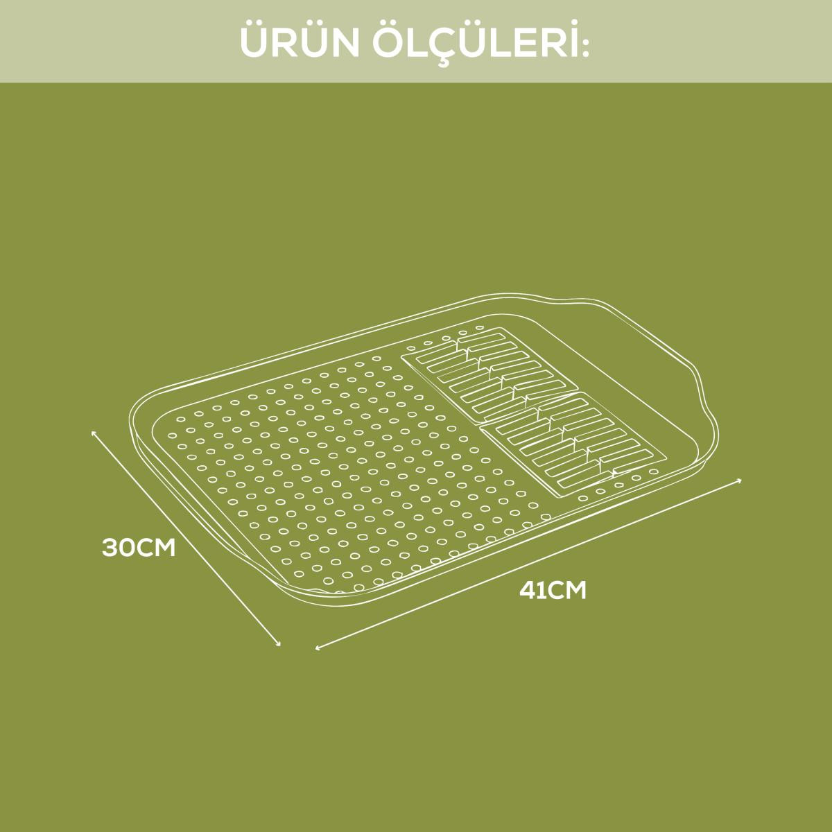 Çok Amaçlı Süzgeçli Kurutma Tepsisi ile Mutfakta Hijyen ve Konfor Bir Arada! Mutfağınızın vazgeçilmezi olacak bu çok amaçlı kurutma tepsisi, hem yiyecek hazırlıklarında hem de bulaşık kurutma süreçlerinde maksimum konfor sağlar. Hijyenik ve Pratik Kullanım: Sebzelerinizi, meyvelerinizi veya balığınızı yıkadıktan sonra süzme işlemini doğrudan bu tepside gerçekleştirebilirsiniz. Süzgeçli yapısı sayesinde su doğrudan alt bölüme akar, gıdalar kuru ve hijyenik kalır. Geniş Kullanım Alanı: Limon, marul, domates, salatalık, biber ve hatta balık gibi birçok ürünü aynı anda yıkayıp süzebilirsiniz. Tepsi tasarımı sayesinde mutfak tezgâhınız ıslanmaz ve düzenli kalır. Kolay Temizlenebilir Tasarım: Çıkarılabilir üst raf sistemi sayesinde hem temizlik hem de kurulum çok kolay! Su biriken alt hazne kolayca boşaltılır ve tüm parçalarda hijyen korunur. Bulaşık Kurutmalığı Olarak Kullanım: Yıkanmış tabak, bardak ve kase gibi mutfak gereçlerini dik yerleştirme aparatları ile düzenli bir şekilde kurutabilirsiniz. Ürün Avantajları: Çift katmanlı su süzgeçli sistem Kaymaz ve sağlam yapı Geniş iç hacim Gıdalar için güvenli plastik malzeme Mutfakta çok amaçlı kullanım Ürün Ölçüleri: 30 x 41 x 4 cm