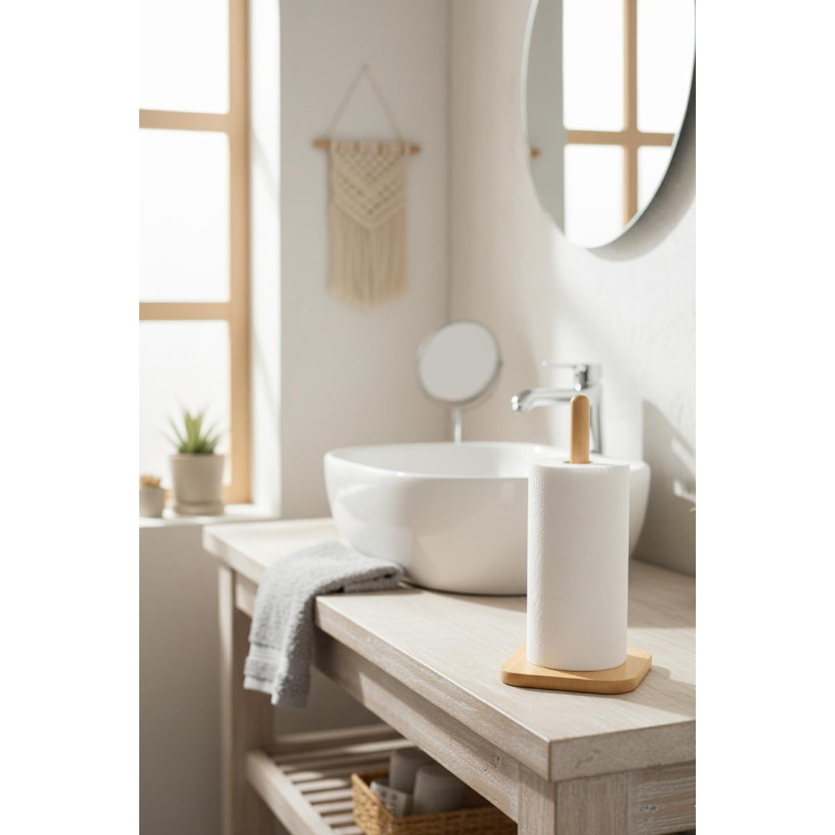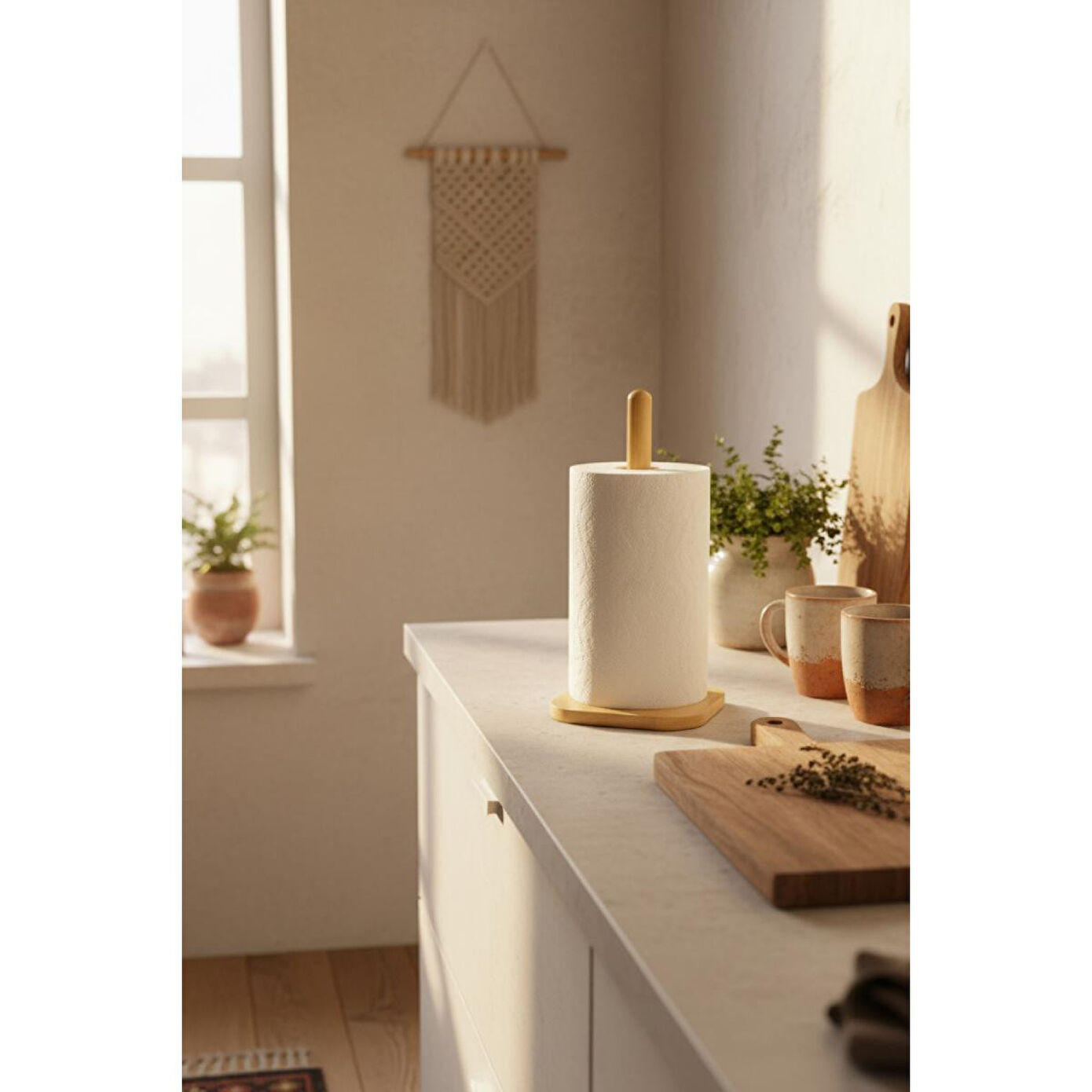 Ahşap kağıt havluluk, sade ve modern tasarımıyla her ortama uyum sağlar.; Sağlam gövdesi ve dengeli tabanı sayesinde hem estetik hem de uzun ömürlü bir kullanım sunar.; ; ; Ürün Özellikleri: ; Ürün Ölçüsü: 12 cm ; Malzeme: %100 doğal ahşap ; Kolay Temizlik: Nemli bezle silinerek kolayca temizlenebilir ; Kullanım Alanı: Mutfak, banyo, ofis veya yemek alanlarında şık bir tamamlayıcı aksesuar ; Doğal Görünüm: Minimalist tasarımıyla tezgah üzerinde düzenli ve estetik bir görünüm sağlar ; ; Neden Bu Ürünü Tercih Etmelisiniz? ; Ekolojik ve çevre dostu bambu malzemeden üretilmiştir.; ; Kolay taşınabilir ve monte gerektirmez.; ; Her dekorasyon tarzına uyum sağlayan modern ve doğal tasarıma sahiptir.; ; ; Paket İçeriği: ; 1 adet bambu kağıt havluluk ;