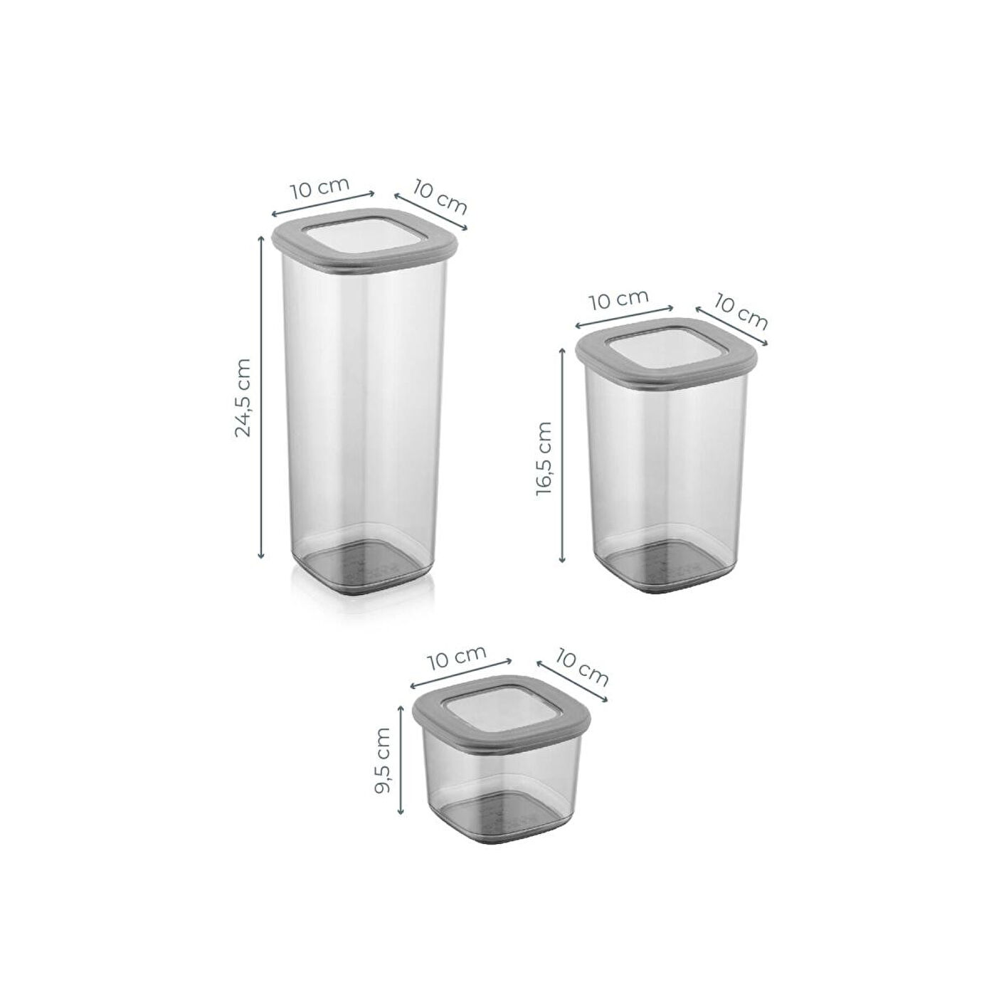 Etiketli Kare Erzak Saklama Kabı 6'lı Set 2x(0,55 litre, 1,2 litre, 1,75 litre) Antrasit Üst üste istiflenebilir Gıdayla temasa uygun plastikten üretilmiştir, darbelere karşı dayanıklıdır BPA İçermez Sağlığa Zarar Vermez Ürün Ölçüleri: 0,55: 10 x 10 x 9,5 cm 1,2: 10 x 10 x 16,5 cm 1,75: 10 x 10 x 24,5 cm