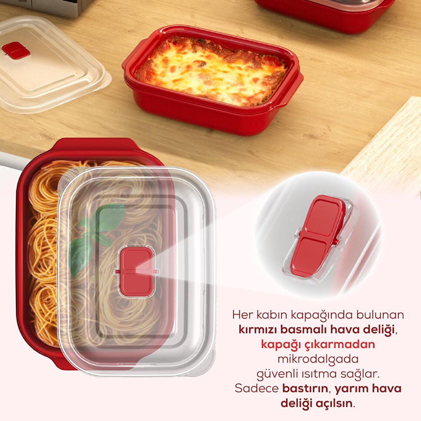 Ürün Açıklaması: Yemek saklamanın en pratik ve hijyenik yolu burada! Kapak Özelliği: Her kabın kapağında bulunan kırmızı basmalı hava deliği, kapağı çıkarmadan mikrodalgada güvenli ısıtma sağlar. Sadece bastırın, yarım hava deliği açılsın – yiyecekleriniz sıçramadan ve nemini kaybetmeden ısınsın! Kap Kapasite ve Boyutlar: 1300 ml: 227 x 150 x 120 mm Buzdolabında saklama, öğle yemeği taşıma ya da yemek servisi için mükemmel çözüm. BPA içermez, elde ve bulaşık makinesinde yıkanabilir. Mikrodalga fırın kullanımına tamamen uygundur (kapak delikli pozisyondayken). İstiflenebilir tasarımıyla yer kazandırır. Neden Bu Ürünü Tercih Etmelisiniz? Hava kontrollü kapak Mikrodalga ve bulaşık makinesine uygun Şık ve modern tasarım