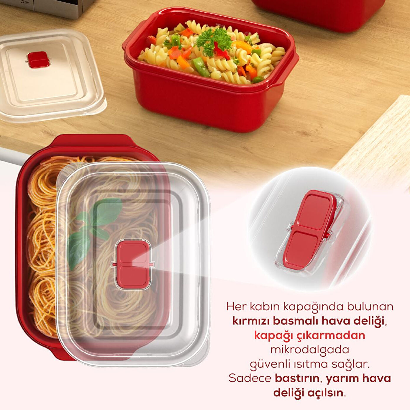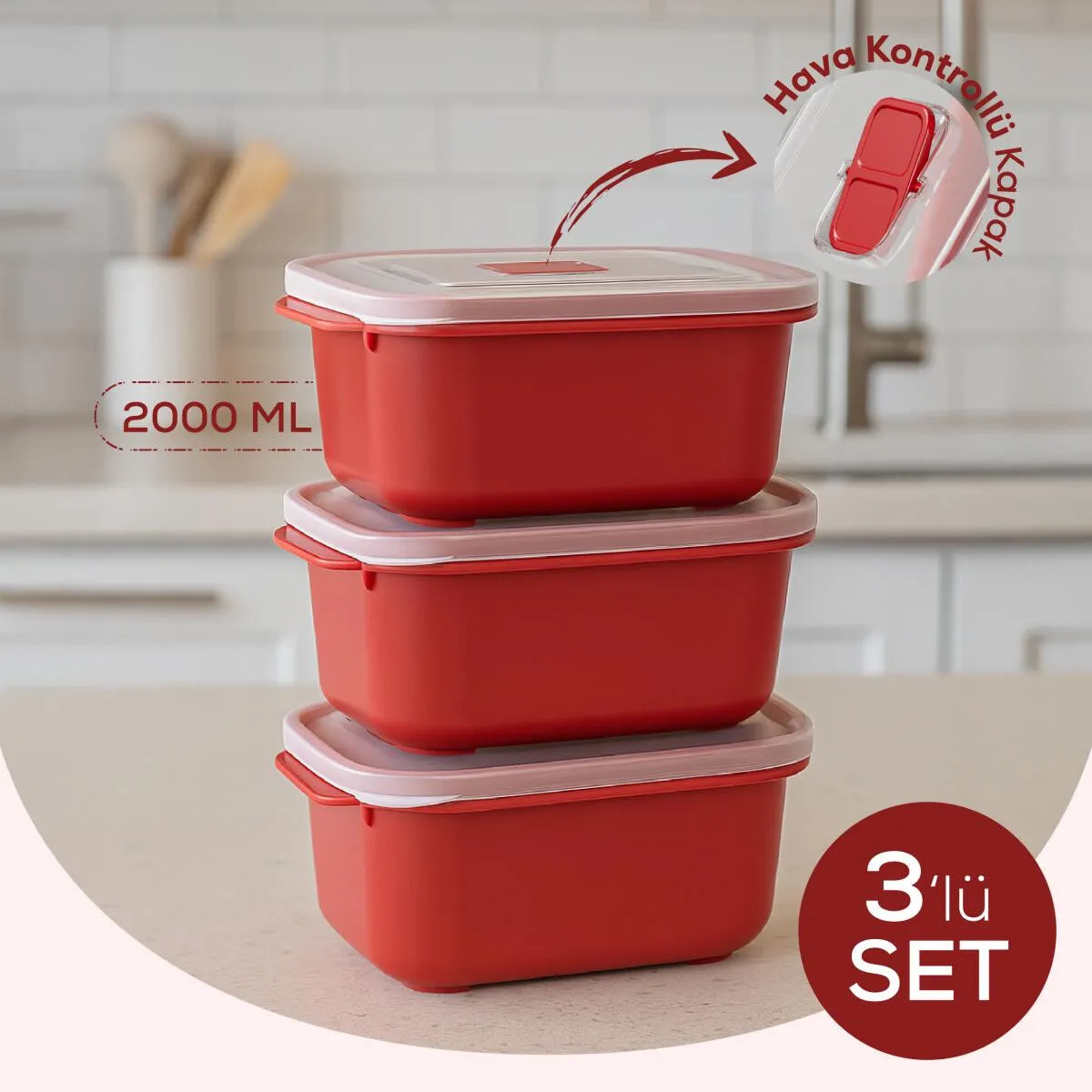 Ürün Açıklaması: Yemek saklamanın en pratik ve hijyenik yolu burada! Kapak Özelliği: Her kabın kapağında bulunan kırmızı basmalı hava deliği, kapağı çıkarmadan mikrodalgada güvenli ısıtma sağlar. Sadece bastırın, yarım hava deliği açılsın – yiyecekleriniz sıçramadan ve nemini kaybetmeden ısınsın! Kap Kapasite ve Boyutlar: 2000 ml: 227 x 155 x 97 mm Buzdolabında saklama, öğle yemeği taşıma ya da yemek servisi için mükemmel çözüm. BPA içermez, elde ve bulaşık makinesinde yıkanabilir. Mikrodalga fırın kullanımına tamamen uygundur (kapak delikli pozisyondayken). İstiflenebilir tasarımıyla yer kazandırır. Neden Bu Ürünü Tercih Etmelisiniz? Hava kontrollü kapak Mikrodalga ve bulaşık makinesine uygun Şık ve modern tasarım
