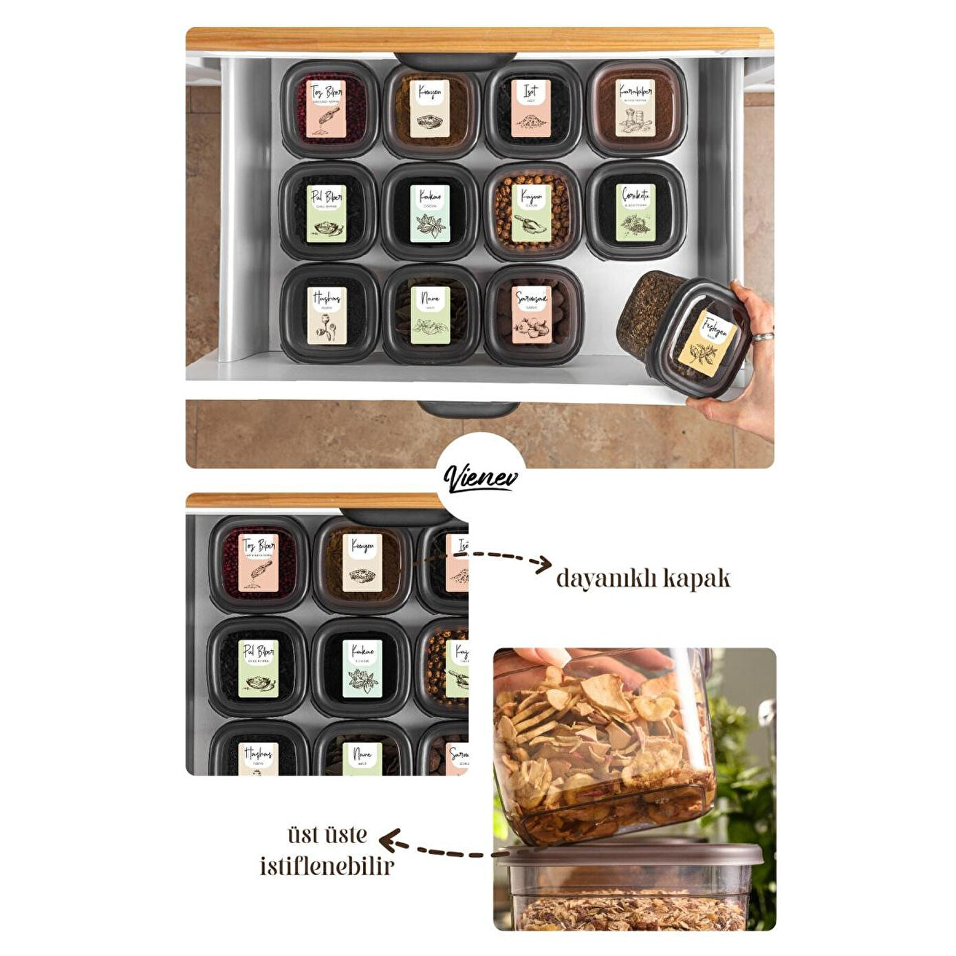 Dayanıklı plastik malzemeden üretilmiş olup, uzun ömürlü kullanım sunar; Kare şekliyle modern ve şık bir görünüm sağlar, mutfak dekorasyonunuza estetik bir dokunuş katar; 6 adet 0,55 litre ve 6 adet 1,75 litre olmak üzere toplamda 12 adet farklı kapasiteye sahip olup, çeşitli erzaklarınızı düzenli bir şekilde saklamanızı kolaylaştırır; Renkli etiketlerle donatılmış olup, içerisindeki yiyeceklerinizi kolayca tanımlamanıza ve bulmanıza olanak tanır; Antrasit rengiyle modern mutfaklar için ideal bir seçimdir; hem şıklığı hem de fonksiyonelliği bir arada sunar;