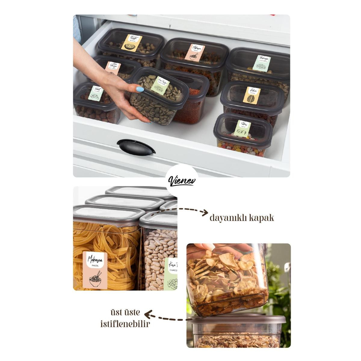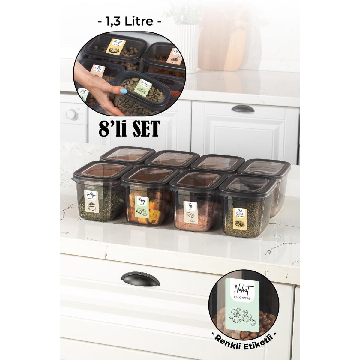 Vienev Renkli Etiketli 8li Set Peggy Dikdörtgen Saklama Kabı 1,3 Litre Antrasit