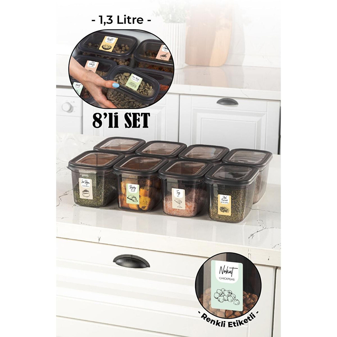 Dayanıklı plastik malzemeden üretilmiş olup, uzun ömürlü kullanım sunar; 1,3 litre kapasitesiyle geniş saklama alanı sağlar, mutfakta düzeni korumanıza yardımcı olur; Renkli etiketleriyle içeriklerinizi kolayca tanımlamanızı ve erişmenizi sağlar; Antrasit rengiyle modern ve şık bir görünüm sunar, mutfak dekorasyonunuza uyum sağlar; Dikdörtgen tasarımı sayesinde farklı boyutlardaki eşyalarınız için ideal saklama çözümüdür;