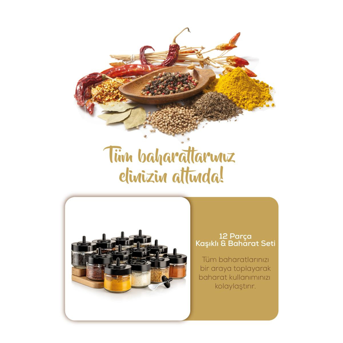 Şıklığı ve Kullanışlılığı Bir Arada Sunan Siyah Serigrafi Etiketli 12'li Baharatlık Takımı ; ; Ürün Özellikleri: ; ; Baharatlarınızı saklamak için estetik ve fonksiyonel bir çözüm sunan 12'li cam baharatlık seti.; ; Her biri şeffaf tasarıma sahip kısa cam baharatlıklar sayesinde içerikleri kolayca görülebilir.; ; Kendinden kaşıklı kapak tasarımı; baharatlarınızı higyenik bir şekilde, dokunmadan kullanma imkanı sağlar.; ; Kaşıklı baharatlık, baharatların dozajını kolayca ayarlamayı mümkün kılar.; ; Siyah serigrafi etiketler, modern mutfaklar için şık bir görsellik ve kolay tanıma avantajı sunar.; ; Her bir baharatlık, dayanıklılık ve uzun ömürlü kullanım için yüksek kaliteli camdan üretilmiştir.; ; Kompakt boyutlar, mutfak tezgahınızda veya dolabınızda minimum yer kaplayacak şekilde tasarlanmıştır.; ; Hacim: 300 cc ; Ürün Ölçüleri:7,5 x 8 cm ; ; Ürün Avantajları: ; ; Kolayca doldurulup temizlenebilir yapı.; ; Estetik görünümüyle mutfak dekorasyonunuza modern bir dokunuş.; ; Yemekleri hazırlarken pratik kullanım sunar ve zaman kazandırır.; ; Şık hediye kutusu içerisinde, eviniz için ya da sevdiklerinize zarif bir hediye seçeneği.; ; Bulaşık makinesinde yıkanabilir özellikte olup, kolay bakım sağlar.; ; ; Set İçeriği: ; ; 12 adet kısa cam baharatlık ; 12 adet kendinden kaşıklı kapağa sahip baharatlık ; Siyah serigrafi etiket; ; Bu kullanışlı ve şık 12'li cam baharatlık takımı ile mutfağınızı yeniden keşfedin.; Baharatların tadını, tazeliğini ve aromasını koruyarak, yemeklerinize lezzet katın ve mutfak rutinlerinizi kolaylaştırın! ;