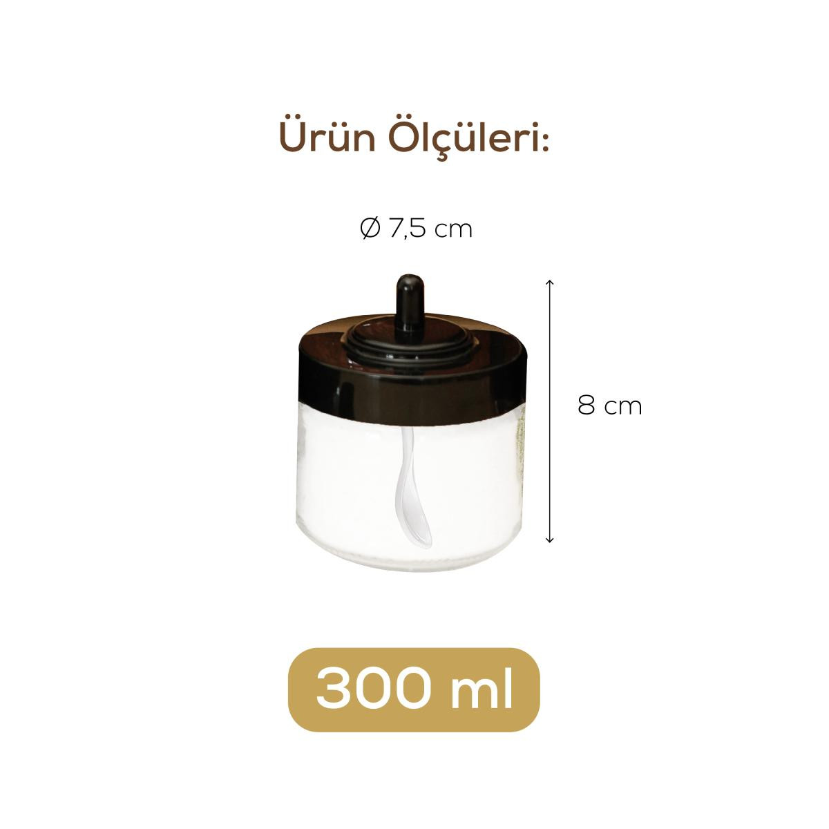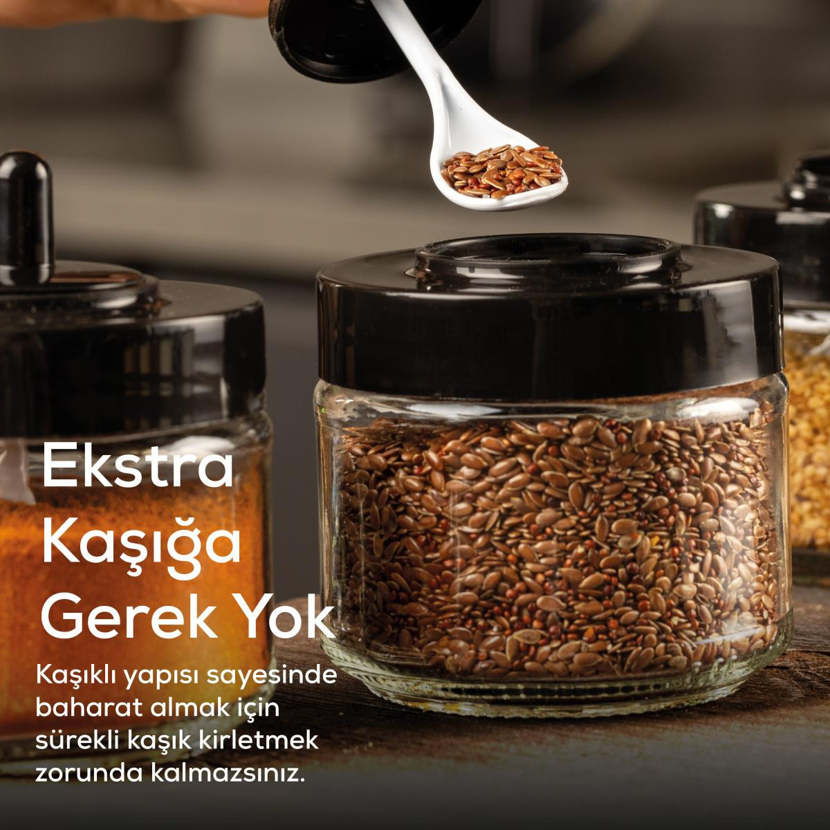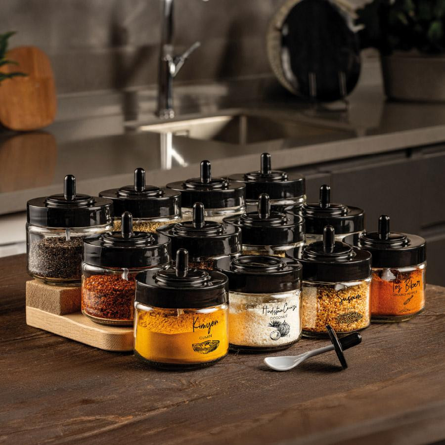Vienev Siyah Serigrafi Etiketli 12 Adet Kapağı Kendinden Kaşıklı Baharatlık Seti Kısa
