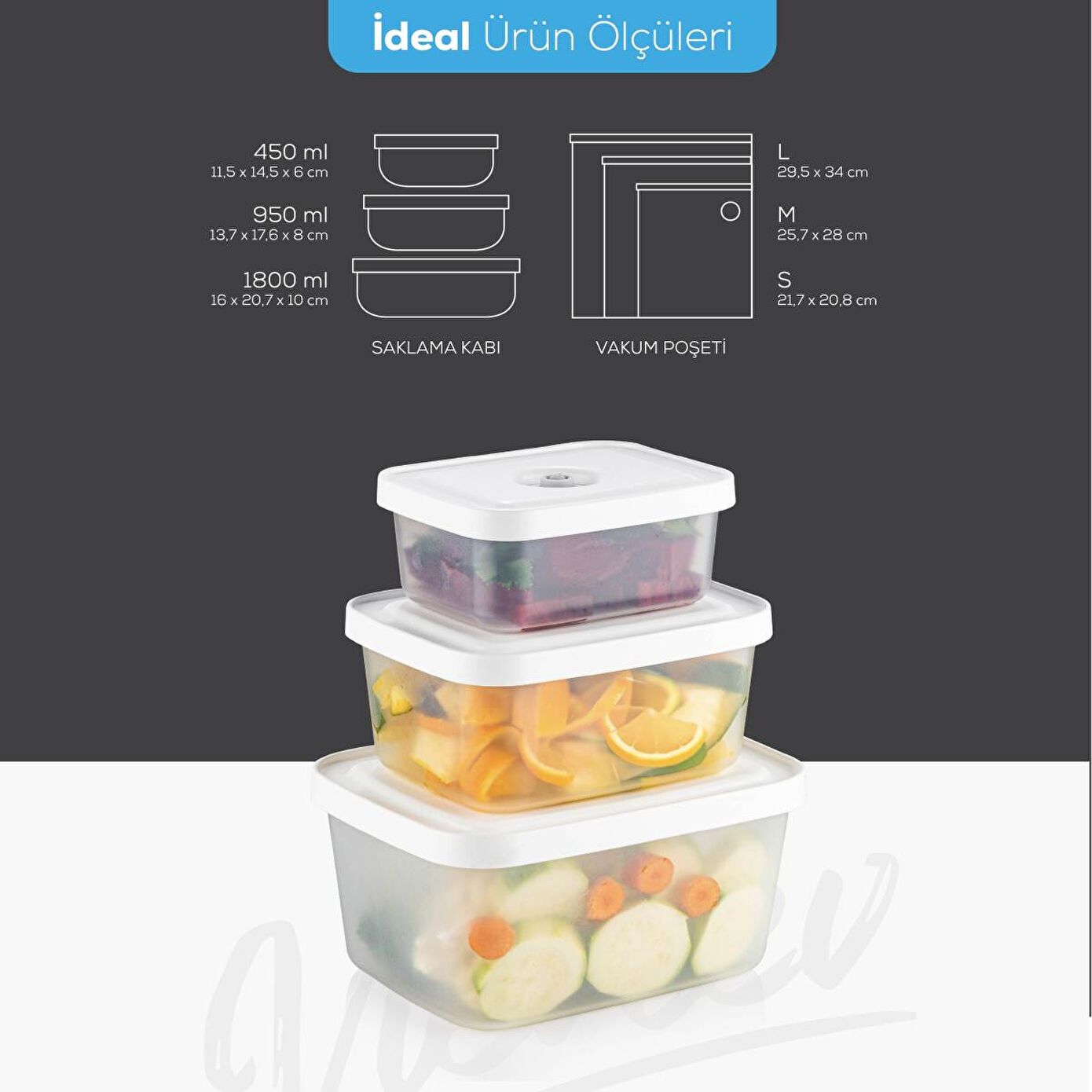 Vakumlu silikon kapaklı saklama kabı, yiyeceklerinizi daha uzun süre taze tutmanıza yardımcı olan yenilikçi vakum teknolojisi ile donatılmıştır. Ergonomik tasarımı sayesinde mutfağınızda hem yer tasarrufu sağlar hem de estetik bir çözüm sunar. Vakum özelliği, yiyeceklerin hava ile temasını tamamen keserek bozulmayı, koku karışımını ve yiyecek israfını önler. Sağlıklı yaşamı destekleyen bu ürün, BPA içermeyen malzemelerden üretilmiştir ve yiyeceklerinizin doğallığını korur. Öne Çıkan Özellikler: Uzun Süreli Tazelik: Vakum teknolojisi sayesinde yiyecekleriniz 5 kata kadar daha uzun süre taze kalır. Yerden Tasarruf: Kompakt yapısı ile buzdolabı ve dolaplarınızda minimum yer kaplar. Koku Karışımını Önler: Yiyeceklerinizi diğer kokulardan izole eder, her defasında taze koku ile karşılaşırsınız. Dayanıklı ve Ergonomik: Silikon kapak ve sağlam yapısıyla uzun ömürlü kullanım sağlar. Sızdırmaz: Vakumlu silikon kapaklar sayesinde sızdırmaz özelliğine sahiptir. Kullanım Kılavuzu Vakum İşlemi: 1.Saklama kabını yiyeceklerinizle doldurun ve kapağı sıkıca kapatın. 2.Pompayı kapağın üst kısmındaki yuvarlak valf bölmesine yerleştirin. 3.Pompa kolunu yukarı ve aşağı hareket ettirerek içerdeki havayı tahliye edin. 4.Valf kısmının içe çekildiğini gördüğünüzde, vakum işlemi tamamlanmıştır. Temizlik ve Bakım: 1.Kapaktaki silikon contayı dikkatlice çıkarın. 2.Contayı ılık su ve sabun ile yıkayın, ardından tamamen kurulayın. 3.Contayı yerine geri takarken tam oturduğundan emin olun. Tam yerleşmeyen conta, vakumun sağlıklı yapılmasını engelleyebilir. ________________________________________ Fresh Poşet Kullanım Kılavuzu Ürün Açıklaması: Fresh poşetler, yiyeceklerinizin tazeliğini uzun süre korumanıza ve saklama alanlarında yer tasarrufu yapmanıza yardımcı olur. Hava ile temas eden yiyeceklerin bozulmasını önler ve aynı zamanda derin dondurucuda güvenle saklanabilir. Seyahatlerde de kullanıma uygun olan bu poşetler, güvenli ve pratik bir saklama çözümü sunar. Öne Çıkan Özellikler: Tazelik Garantisi: Fresh poşetler, yiyeceklerinizin tazeliğini ve lezzetini uzun süre muhafaza eder. Yer Tasarrufu: Dolaplarınızda veya dondurucularınızda daha fazla alan açar. Çok Yönlü Kullanım: Buzdolabı, dondurucu ve mutfak dolaplarında güvenle kullanabilirsiniz. Dayanıklı Malzeme: Yırtılmaya ve delinmeye karşı dayanıklı malzemelerle üretilmiştir. Kullanım Talimatları: Poşetin Hazırlanması: 1.Poşetin içerisine yiyeceklerinizi yerleştirin ve elinizle fazla havayı çıkarın. 2.Poşetin kilidini tamamen kapatın. Poşet tam kapanmadıysa, kilit kısmını tekrar kontrol edin. Vakum İşlemi: 1.Poşetin köşesinde bulunan valfin üzerindeki etiketi çıkarın ve pompayı bu bölgeye yerleştirin. 2.Poşeti düz bir zemine yerleştirin ve pompayı sıkıca bastırarak vakum işlemini başlatın. 3.Pompa kolunu yukarı ve aşağı hareket ettirerek poşetin içindeki havayı boşaltın. Valfin düzgün çalıştığından emin olun. Sıvı İçeren Ürünler: Sıvı içerikli ürünlerle kullanırken dikkatli olun. Vakum işlemi sıvılar varken yapılmamalıdır. Ürünü önce dondurduktan sonra vakumlayabilirsiniz. Saklama ve Kullanım: Vakum işlemi tamamlandıktan sonra poşetlerinizi buzdolabı, dondurucu veya mutfak dolaplarında güvenle saklayabilirsiniz. Poşetlerin tekrar kullanılabilir olduğunu unutmayın; bu sayede hem çevre dostu bir seçim yapmış olursunuz hem de maliyet tasarrufu sağlarsınız. Ürün İçeriği 2 Adet Saklama Kabı 1800 ml Saklama Kabı Hacim ve Ölçüleri: 1800 ml : 16 x 20,7 x10 cm Gıdalarınızı sağlıklı, güvenli ve uzun ömürlü bir şekilde muhafaza etmek istiyorsanız Vacuum Fresh Set tam size göre!