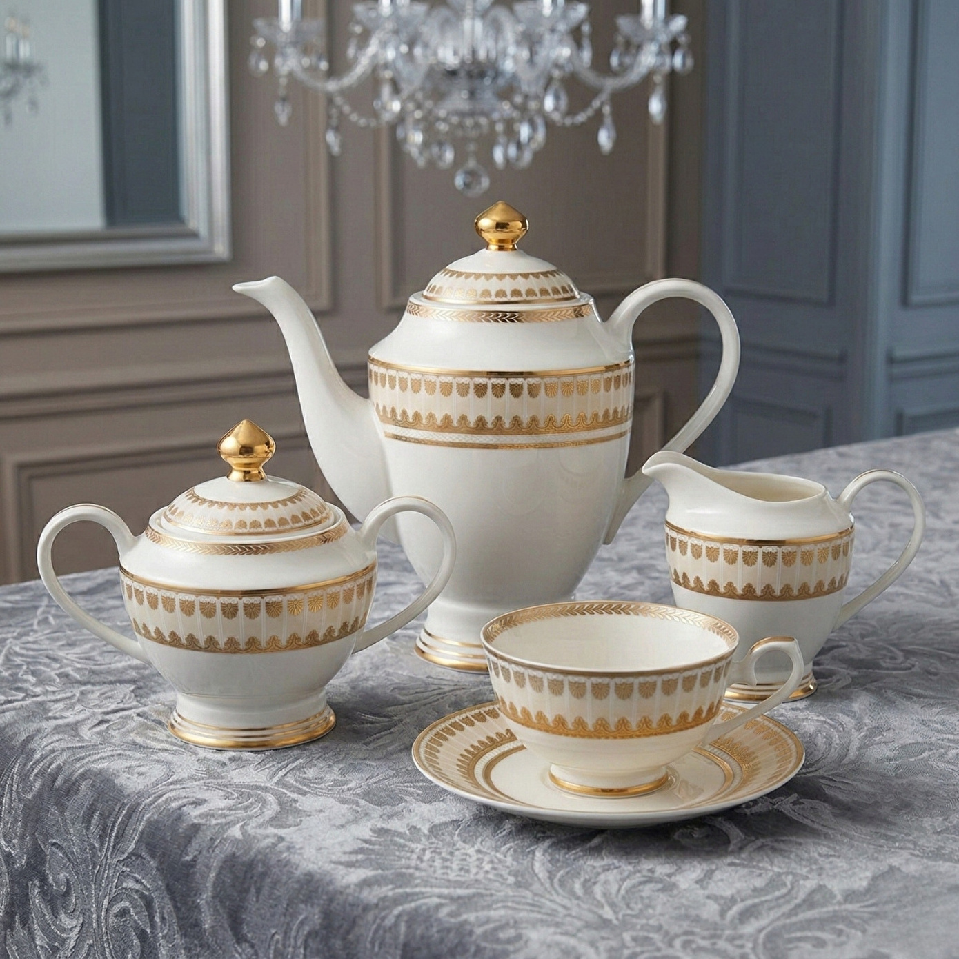 Gelenek ve tecrübeyle hayat bulan porselenler Alman kültürel mirasıyla, zarafet, asalet ve zamansız güzelliği birleştiren, her tasarımında bir hikaye anlatıyor. Barok sanatının en iyi altın vurgularını, kabartma desenlerin ihtişamlı çizgisini, saraylara özgü özel dokunuşunu yansıtıyor. Usta zanaatkarların ellerinden çıkan çarpıcı motifler, günümüzün modern ve asil beyaz porselen dokusuyla birleşerek saray ihtişamını kuşaktan kuşağa aktarıyor.