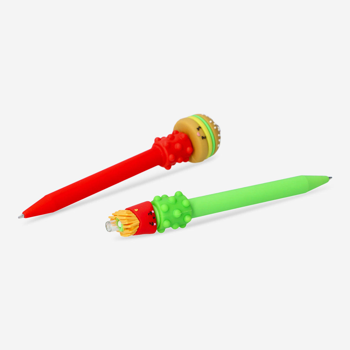 Burger ve patates kızartması başlıklı ikili tükenmez kalem seti ile yazma rutininize eğlenceli bir dokunuş katın ! Bu eğlenceli setin her kalemi, popüler atıştırmalıklardan ilham alınarak tasarlanmış sevimli uçlarla süslenmiş olup, kırtasiye koleksiyonunuza neşeli bir hava katmaktadır.