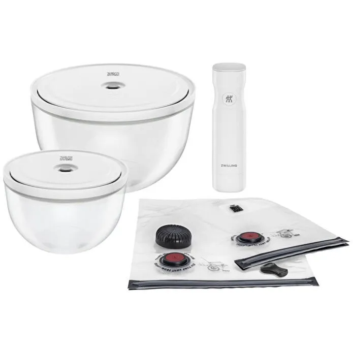 Benzersiz tazelik sistemimiz: hazırlayın, servis yapın, saklayın. Hazırlama, pişirme, servis ve saklama için hepsi bir arada vakum sistemi. Vakum teknolojisi sayesinde yiyecekleri 5 kat daha uzun süre taze tutun.* Bulaşık makinesi, dondurucu, mikrodalga ve fırın (180°C'ye kadar) için uygundur. BPA içermez. ZWILLING FRESH & SAVE KASELER ile yenilik ve tazelik bir arada. Bu hepsi bir arada vakum seti, favori yemeklerinizi hazırlamak, pişirmek, servis yapmak ve saklamak için iki kase içerir. Vakum kapakları sayesinde yiyecekler vakumlanarak buzdolabında veya dondurucuda saklanabilir ve tazeliğini 5 kata kadar daha uzun süre korur.* Kullanımı çok basittir: vakum pompasını valfe yerleştirin, düğmeye basın, işlem tamam! Kapaklar ayrıca kulpsuz STAUB CERAMIQUE kaselerle uyumludur ve ekstra çok yönlülük sunar. Vakum poşetleri ise dondurma, sous-vide pişirme veya marine için maksimum tazelik sağlar. *Geleneksel vakumsuz saklamaya kıyasla. Yemek hazırlığı, pişirme, servis ve saklama için çok yönlü kullanım sunar. Vakumla mühürlenen yiyecekler, tazeliğini 5 kata kadar daha uzun süre korur. Yenilikçi çift vakumlama teknolojisine sahip vakum kapaklar Tüm kaseler bulaşık makinesinde yıkanabilir, dondurucuya ve mikrodalgaya uygundur; ayrıca (kapaksız olarak 180 °C’ye kadar) fırına da dayanıklıdır. Kapaklar, ilgili boyutlardaki tüm ZWILLING FRESH & SAVE KASELER ve kulpsuz STAUB CERAMIQUE kaselerle uyumludur. Set, vakum kapaklı 2 adet FRESH & SAVE cam kase (M/L), fermuarı ve marine etme aparatıyla birlikte 2 adet vakum poşeti (S+M) ve 1 adet vakum pompası içerir. Tüm FRESH & SAVE pompalar ve kapaklar birbiriyle uyumludur.